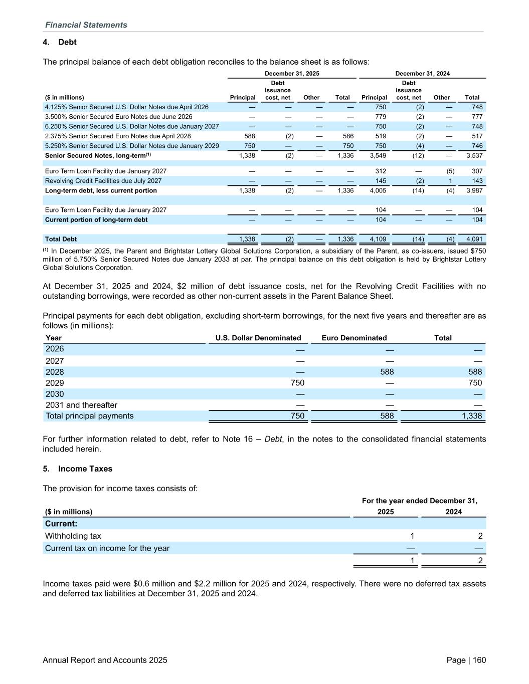 4. Debt The principal balance of each debt obligation reconciles to the balance sheet is as follows: December 31, 2025 December 31, 2024 ($ in millions) Principal Debt issuance cost, net Other Total Principal Debt issuance cost, net Other Total 4.125% Senior Secured U.S. Dollar Notes due April 2026 — — — — 750 (2) — 748 3.500% Senior Secured Euro Notes due June 2026 — — — — 779 (2) — 777 6.250% Senior Secured U.S. Dollar Notes due January 2027 — — — — 750 (2) — 748 2.375% Senior Secured Euro Notes due April 2028 588 (2) — 586 519 (2) — 517 5.250% Senior Secured U.S. Dollar Notes due January 2029 750 — — 750 750 (4) — 746 Senior Secured Notes, long-term(1) 1,338 (2) — 1,336 3,549 (12) — 3,537 Euro Term Loan Facility due January 2027 — — — — 312 — (5) 307 Revolving Credit Facilities due July 2027 — — — — 145 (2) 1 143 Long-term debt, less current portion 1,338 (2) — 1,336 4,005 (14) (4) 3,987 Euro Term Loan Facility due January 2027 — — — — 104 — — 104 Current portion of long-term debt — — — — 104 — — 104 Total Debt 1,338 (2) — 1,336 4,109 (14) (4) 4,091 (1) In December 2025, the Parent and Brightstar Lottery Global Solutions Corporation, a subsidiary of the Parent, as co-issuers, issued $750 million of 5.750% Senior Secured Notes due January 2033 at par. The principal balance on this debt obligation is held by Brightstar Lottery Global Solutions Corporation. At December 31, 2025 and 2024, $2 million of debt issuance costs, net for the Revolving Credit Facilities with no outstanding borrowings, were recorded as other non-current assets in the Parent Balance Sheet. Principal payments for each debt obligation, excluding short-term borrowings, for the next five years and thereafter are as follows (in millions): Year U.S. Dollar Denominated Euro Denominated Total 2026 — — — 2027 — — — 2028 — 588 588 2029 750 — 750 2030 — — — 2031 and thereafter — — — Total principal payments 750 588 1,338 For further information related to debt, refer to Note 16 – Debt, in the notes to the consolidated financial statements included herein. 5. Income Taxes The provision for income taxes consists of: For the year ended December 31, ($ in millions) 2025 2024 Current: Withholding tax 1 2 Current tax on income for the year — — 1 2 Income taxes paid were $0.6 million and $2.2 million for 2025 and 2024, respectively. There were no deferred tax assets and deferred tax liabilities at December 31, 2025 and 2024. Financial Statements Annual Report and Accounts 2025 Page | 160