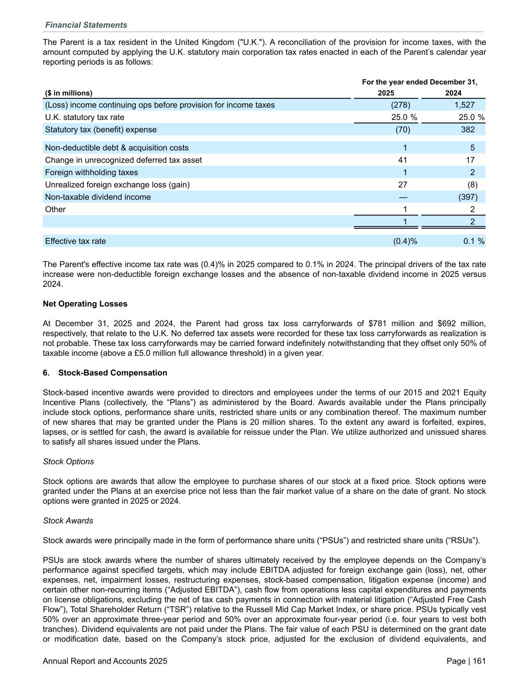 The Parent is a tax resident in the United Kingdom ("U.K."). A reconciliation of the provision for income taxes, with the amount computed by applying the U.K. statutory main corporation tax rates enacted in each of the Parent’s calendar year reporting periods is as follows: For the year ended December 31, ($ in millions) 2025 2024 (Loss) income continuing ops before provision for income taxes (278) 1,527 U.K. statutory tax rate 25.0 % 25.0 % Statutory tax (benefit) expense (70) 382 Non-deductible debt & acquisition costs 1 5 Change in unrecognized deferred tax asset 41 17 Foreign withholding taxes 1 2 Unrealized foreign exchange loss (gain) 27 (8) Non-taxable dividend income — (397) Other 1 2 1 2 Effective tax rate (0.4) % 0.1 % The Parent's effective income tax rate was (0.4)% in 2025 compared to 0.1% in 2024. The principal drivers of the tax rate increase were non-deductible foreign exchange losses and the absence of non-taxable dividend income in 2025 versus 2024. Net Operating Losses At December 31, 2025 and 2024, the Parent had gross tax loss carryforwards of $781 million and $692 million, respectively, that relate to the U.K. No deferred tax assets were recorded for these tax loss carryforwards as realization is not probable. These tax loss carryforwards may be carried forward indefinitely notwithstanding that they offset only 50% of taxable income (above a £5.0 million full allowance threshold) in a given year. 6. Stock-Based Compensation Stock-based incentive awards were provided to directors and employees under the terms of our 2015 and 2021 Equity Incentive Plans (collectively, the “Plans”) as administered by the Board. Awards available under the Plans principally include stock options, performance share units, restricted share units or any combination thereof. The maximum number of new shares that may be granted under the Plans is 20 million shares. To the extent any award is forfeited, expires, lapses, or is settled for cash, the award is available for reissue under the Plan. We utilize authorized and unissued shares to satisfy all shares issued under the Plans. Stock Options Stock options are awards that allow the employee to purchase shares of our stock at a fixed price. Stock options were granted under the Plans at an exercise price not less than the fair market value of a share on the date of grant. No stock options were granted in 2025 or 2024. Stock Awards Stock awards were principally made in the form of performance share units (“PSUs”) and restricted share units (“RSUs”). PSUs are stock awards where the number of shares ultimately received by the employee depends on the Company’s performance against specified targets, which may include EBITDA adjusted for foreign exchange gain (loss), net, other expenses, net, impairment losses, restructuring expenses, stock-based compensation, litigation expense (income) and certain other non-recurring items (“Adjusted EBITDA”), cash flow from operations less capital expenditures and payments on license obligations, excluding the net of tax cash payments in connection with material litigation (“Adjusted Free Cash Flow”), Total Shareholder Return (“TSR”) relative to the Russell Mid Cap Market Index, or share price. PSUs typically vest 50% over an approximate three-year period and 50% over an approximate four-year period (i.e. four years to vest both tranches). Dividend equivalents are not paid under the Plans. The fair value of each PSU is determined on the grant date or modification date, based on the Company’s stock price, adjusted for the exclusion of dividend equivalents, and Financial Statements Annual Report and Accounts 2025 Page | 161