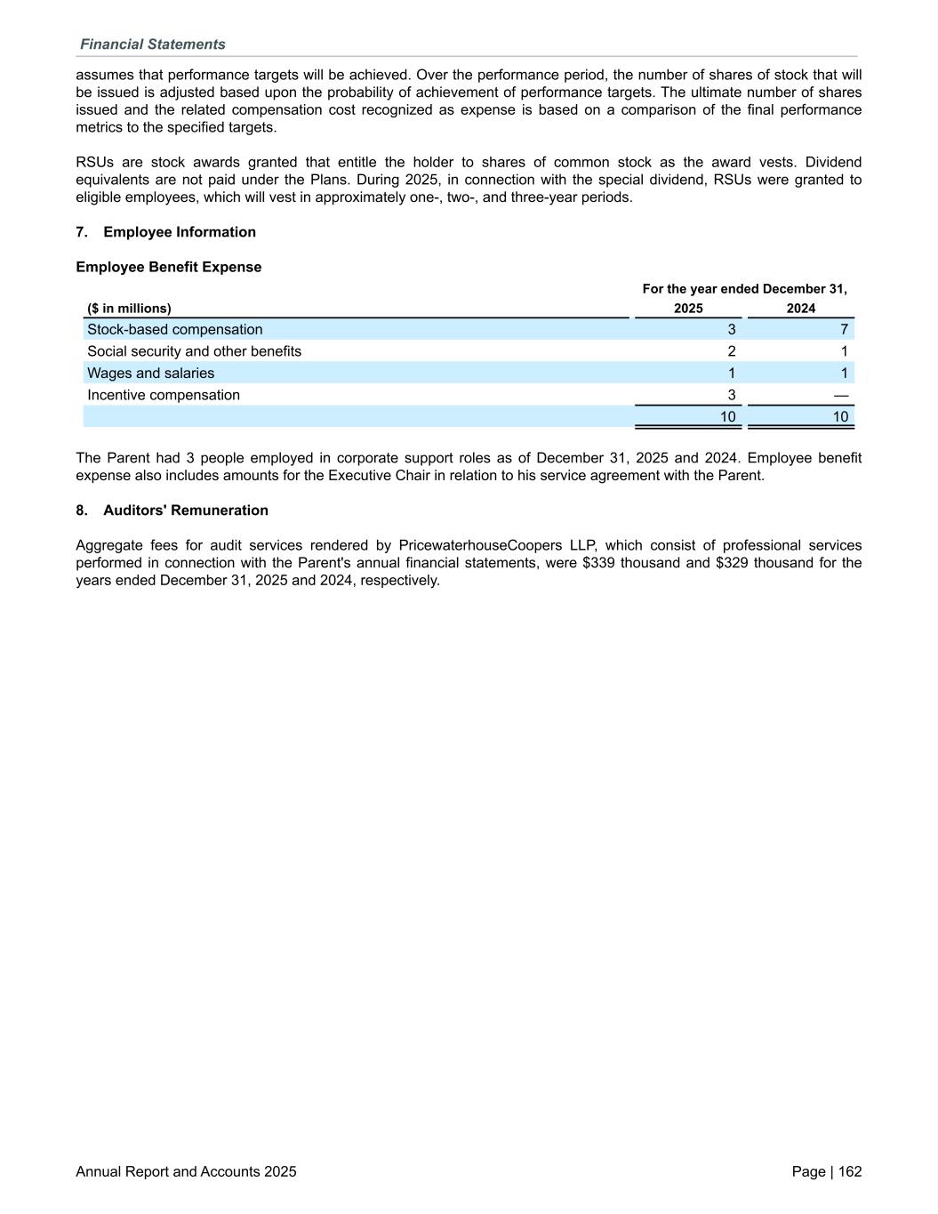 assumes that performance targets will be achieved. Over the performance period, the number of shares of stock that will be issued is adjusted based upon the probability of achievement of performance targets. The ultimate number of shares issued and the related compensation cost recognized as expense is based on a comparison of the final performance metrics to the specified targets. RSUs are stock awards granted that entitle the holder to shares of common stock as the award vests. Dividend equivalents are not paid under the Plans. During 2025, in connection with the special dividend, RSUs were granted to eligible employees, which will vest in approximately one-, two-, and three-year periods. 7. Employee Information Employee Benefit Expense For the year ended December 31, ($ in millions) 2025 2024 Stock-based compensation 3 7 Social security and other benefits 2 1 Wages and salaries 1 1 Incentive compensation 3 — 10 10 The Parent had 3 people employed in corporate support roles as of December 31, 2025 and 2024. Employee benefit expense also includes amounts for the Executive Chair in relation to his service agreement with the Parent. 8. Auditors' Remuneration Aggregate fees for audit services rendered by PricewaterhouseCoopers LLP, which consist of professional services performed in connection with the Parent's annual financial statements, were $339 thousand and $329 thousand for the years ended December 31, 2025 and 2024, respectively. Financial Statements Annual Report and Accounts 2025 Page | 162