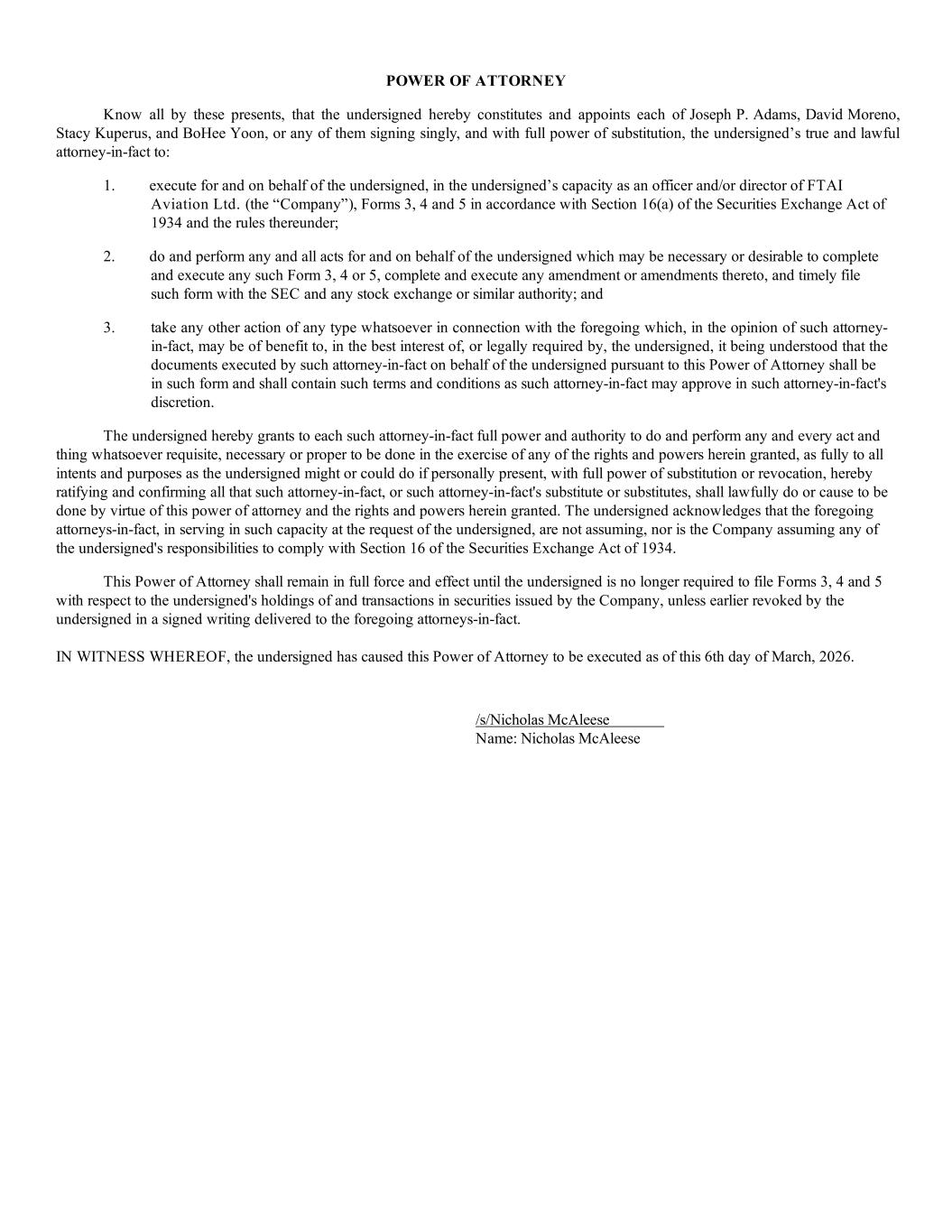 POWER OF ATTORNEY Know all by these presents, that the undersigned hereby constitutes and appoints each of Joseph P. Adams, David Moreno, Stacy Kuperus, and BoHee Yoon, or any of them signing singly, and with full power of substitution, the undersigned’s true and lawful attorney-in-fact to: 1. execute for and on behalf of the undersigned, in the undersigned’s capacity as an officer and/or director of FTAI Aviation Ltd. (the “Company”), Forms 3, 4 and 5 in accordance with Section 16(a) of the Securities Exchange Act of 1934 and the rules thereunder; 2. do and perform any and all acts for and on behalf of the undersigned which may be necessary or desirable to complete and execute any such Form 3, 4 or 5, complete and execute any amendment or amendments thereto, and timely file such form with the SEC and any stock exchange or similar authority; and 3. take any other action of any type whatsoever in connection with the foregoing which, in the opinion of such attorney- in-fact, may be of benefit to, in the best interest of, or legally required by, the undersigned, it being understood that the documents executed by such attorney-in-fact on behalf of the undersigned pursuant to this Power of Attorney shall be in such form and shall contain such terms and conditions as such attorney-in-fact may approve in such attorney-in-fact's discretion. The undersigned hereby grants to each such attorney-in-fact full power and authority to do and perform any and every act and thing whatsoever requisite, necessary or proper to be done in the exercise of any of the rights and powers herein granted, as fully to all intents and purposes as the undersigned might or could do if personally present, with full power of substitution or revocation, hereby ratifying and confirming all that such attorney-in-fact, or such attorney-in-fact's substitute or substitutes, shall lawfully do or cause to be done by virtue of this power of attorney and the rights and powers herein granted. The undersigned acknowledges that the foregoing attorneys-in-fact, in serving in such capacity at the request of the undersigned, are not assuming, nor is the Company assuming any of the undersigned's responsibilities to comply with Section 16 of the Securities Exchange Act of 1934. This Power of Attorney shall remain in full force and effect until the undersigned is no longer required to file Forms 3, 4 and 5 with respect to the undersigned's holdings of and transactions in securities issued by the Company, unless earlier revoked by the undersigned in a signed writing delivered to the foregoing attorneys-in-fact. IN WITNESS WHEREOF, the undersigned has caused this Power of Attorney to be executed as of this 6th day of March, 2026. /s/Nicholas McAleese Name: Nicholas McAleese