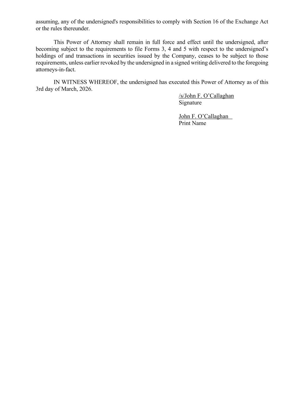 assuming, any of the undersigned's responsibilities to comply with Section 16 of the Exchange Act or the rules thereunder. This Power of Attorney shall remain in full force and effect until the undersigned, after becoming subject to the requirements to file Forms 3, 4 and 5 with respect to the undersigned’s holdings of and transactions in securities issued by the Company, ceases to be subject to those requirements, unless earlier revoked by the undersigned in a signed writing delivered to the foregoing attorneys-in-fact. IN WITNESS WHEREOF, the undersigned has executed this Power of Attorney as of this 3rd day of March, 2026. /s/John F. O’Callaghan Signature John F. O’Callaghan Print Name