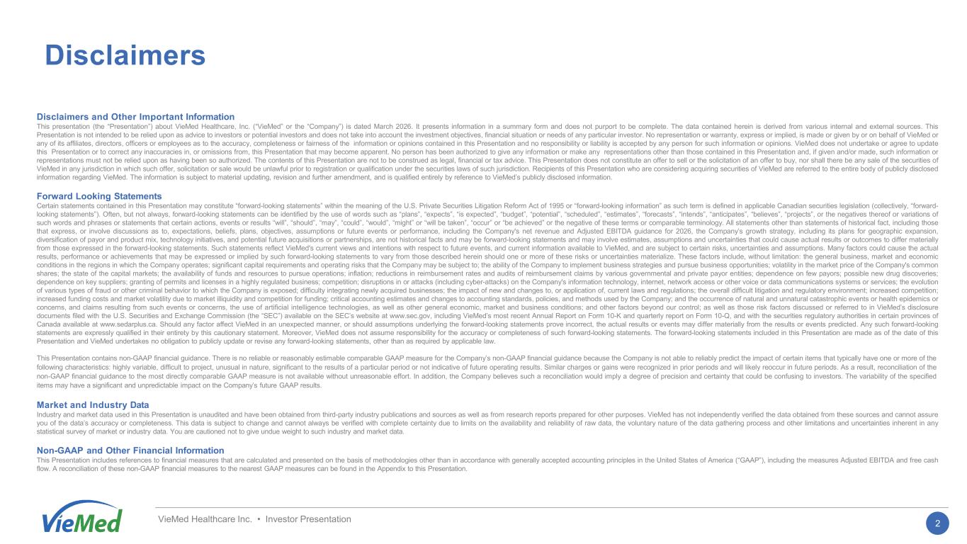 Disclaimers VieMed Healthcare Inc. • Investor Presentation Disclaimers and Other Important Information This presentation (the “Presentation”) about VieMed Healthcare, Inc. (“VieMed” or the “Company”) is dated March 2026. It presents information in a summary form and does not purport to be complete. The data contained herein is derived from various internal and external sources. This Presentation is not intended to be relied upon as advice to investors or potential investors and does not take into account the investment objectives, financial situation or needs of any particular investor. No representation or warranty, express or implied, is made or given by or on behalf of VieMed or any of its affiliates, directors, officers or employees as to the accuracy, completeness or fairness of the information or opinions contained in this Presentation and no responsibility or liability is accepted by any person for such information or opinions. VieMed does not undertake or agree to update this Presentation or to correct any inaccuracies in, or omissions from, this Presentation that may become apparent. No person has been authorized to give any information or make any representations other than those contained in this Presentation and, if given and/or made, such information or representations must not be relied upon as having been so authorized. The contents of this Presentation are not to be construed as legal, financial or tax advice. This Presentation does not constitute an offer to sell or the solicitation of an offer to buy, nor shall there be any sale of the securities of VieMed in any jurisdiction in which such offer, solicitation or sale would be unlawful prior to registration or qualification under the securities laws of such jurisdiction. Recipients of this Presentation who are considering acquiring securities of VieMed are referred to the entire body of publicly disclosed information regarding VieMed. The information is subject to material updating, revision and further amendment, and is qualified entirely by reference to VieMed’s publicly disclosed information. Forward Looking Statements Certain statements contained in this Presentation may constitute “forward-looking statements” within the meaning of the U.S. Private Securities Litigation Reform Act of 1995 or “forward-looking information” as such term is defined in applicable Canadian securities legislation (collectively, “forward- looking statements”). Often, but not always, forward-looking statements can be identified by the use of words such as “plans”, “expects”, “is expected”, “budget”, “potential”, “scheduled”, “estimates”, “forecasts”, “intends”, “anticipates”, “believes”, “projects”, or the negatives thereof or variations of such words and phrases or statements that certain actions, events or results “will”, “should”, “may”, “could”, “would”, “might” or “will be taken”, “occur” or “be achieved” or the negative of these terms or comparable terminology. All statements other than statements of historical fact, including those that express, or involve discussions as to, expectations, beliefs, plans, objectives, assumptions or future events or performance, including the Company's net revenue and Adjusted EBITDA guidance for 2026, the Company’s growth strategy, including its plans for geographic expansion, diversification of payor and product mix, technology initiatives, and potential future acquisitions or partnerships, are not historical facts and may be forward-looking statements and may involve estimates, assumptions and uncertainties that could cause actual results or outcomes to differ materially from those expressed in the forward-looking statements. Such statements reflect VieMed's current views and intentions with respect to future events, and current information available to VieMed, and are subject to certain risks, uncertainties and assumptions. Many factors could cause the actual results, performance or achievements that may be expressed or implied by such forward-looking statements to vary from those described herein should one or more of these risks or uncertainties materialize. These factors include, without limitation: the general business, market and economic conditions in the regions in which the Company operates; significant capital requirements and operating risks that the Company may be subject to; the ability of the Company to implement business strategies and pursue business opportunities; volatility in the market price of the Company's common shares; the state of the capital markets; the availability of funds and resources to pursue operations; inflation; reductions in reimbursement rates and audits of reimbursement claims by various governmental and private payor entities; dependence on few payors; possible new drug discoveries; dependence on key suppliers; granting of permits and licenses in a highly regulated business; competition; disruptions in or attacks (including cyber-attacks) on the Company's information technology, internet, network access or other voice or data communications systems or services; the evolution of various types of fraud or other criminal behavior to which the Company is exposed; difficulty integrating newly acquired businesses; the impact of new and changes to, or application of, current laws and regulations; the overall difficult litigation and regulatory environment; increased competition; increased funding costs and market volatility due to market illiquidity and competition for funding; critical accounting estimates and changes to accounting standards, policies, and methods used by the Company; and the occurrence of natural and unnatural catastrophic events or health epidemics or concerns, and claims resulting from such events or concerns, the use of artificial intelligence technologies, as well as other general economic, market and business conditions; and other fa