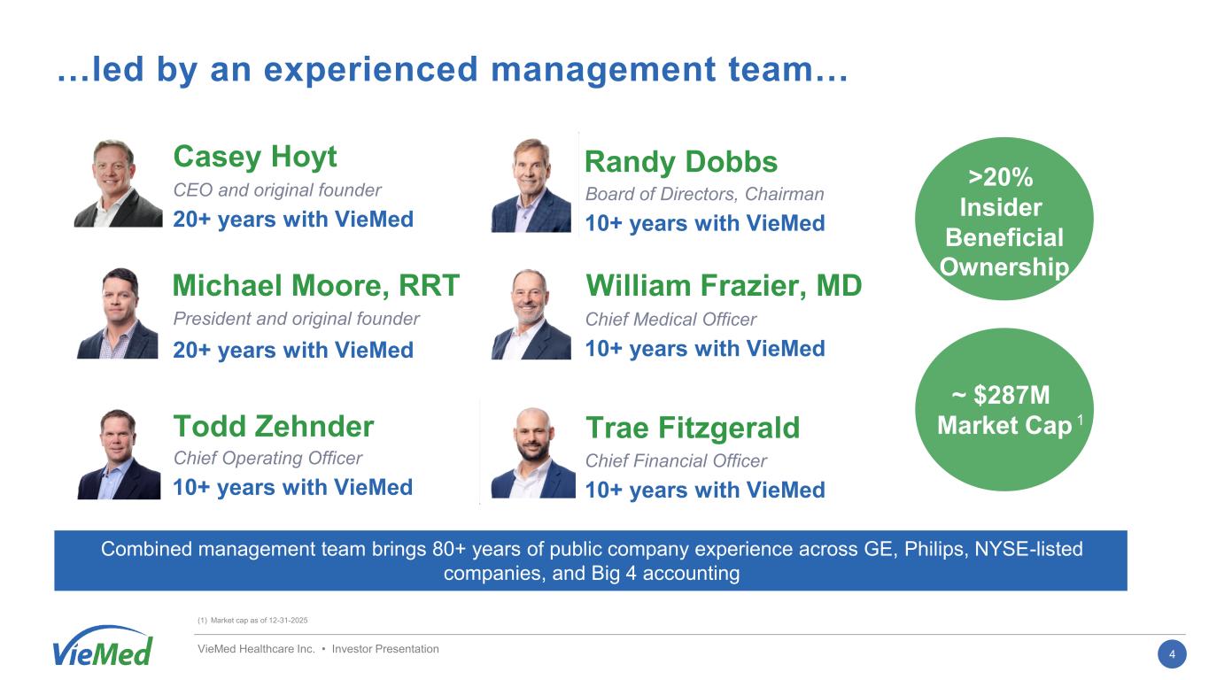 An innovative, national in-home healthcare leader built on clinical excellence... High-touch and high-tech services care model drives cost reduction, increases patient satisfaction and reduces rehospitalizations. VieMed Healthcare Inc. • Investor Presentation 3 Founded in 2006 • Public since 2017 • Headquartered in Lafayette, Louisiana Built a Platform Around Complex Respiratory Services Extensive Nationwide Reach Innovative At-Home Healthcare Robust Growth and Financial Performance 26% compounded annual revenue growth rate since public listing, $28M FCF in 2025, and no net debt. Serving over 172,000 patients with a capex-light business model in all 50 states. Home-based care platform built on the reputation of clinical excellence in ventilation. Now leveraging our core platform to include sleep, oxygen, airway clearance and maternal health.