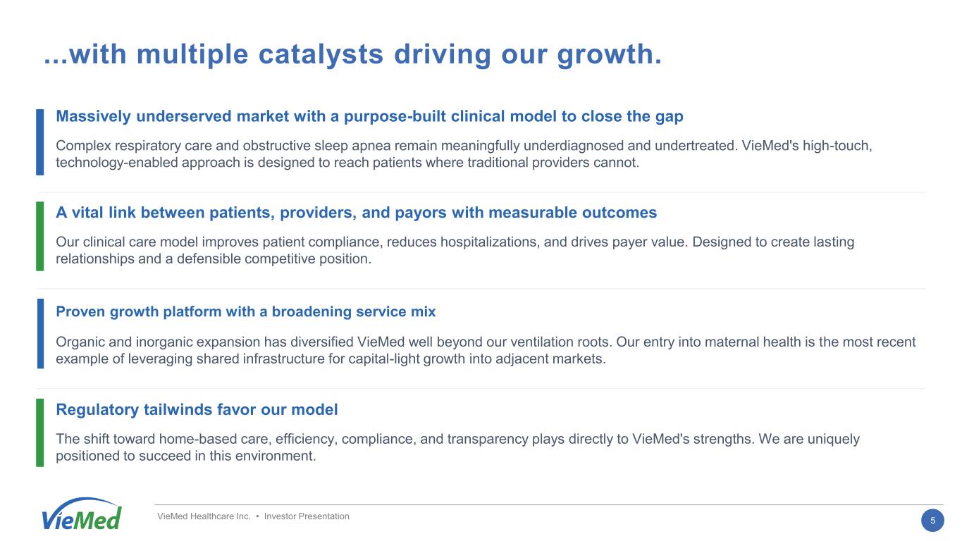 …led by an experienced management team… VieMed Healthcare Inc. • Investor Presentation 4 Casey Hoyt CEO and original founder 20+ years with VieMed Michael Moore, RRT President and original founder 20+ years with VieMed Todd Zehnder Chief Operating Officer 10+ years with VieMed Randy Dobbs Board of Directors, Chairman 10+ years with VieMed William Frazier, MD Chief Medical Officer 10+ years with VieMed Trae Fitzgerald Chief Financial Officer 10+ years with VieMed Combined management team brings 80+ years of public company experience across GE, Philips, NYSE-listed companies, and Big 4 accounting ~ $287M Market Cap >20% Insider Beneficial Ownership (1) Market cap as of 12-31-2025 1