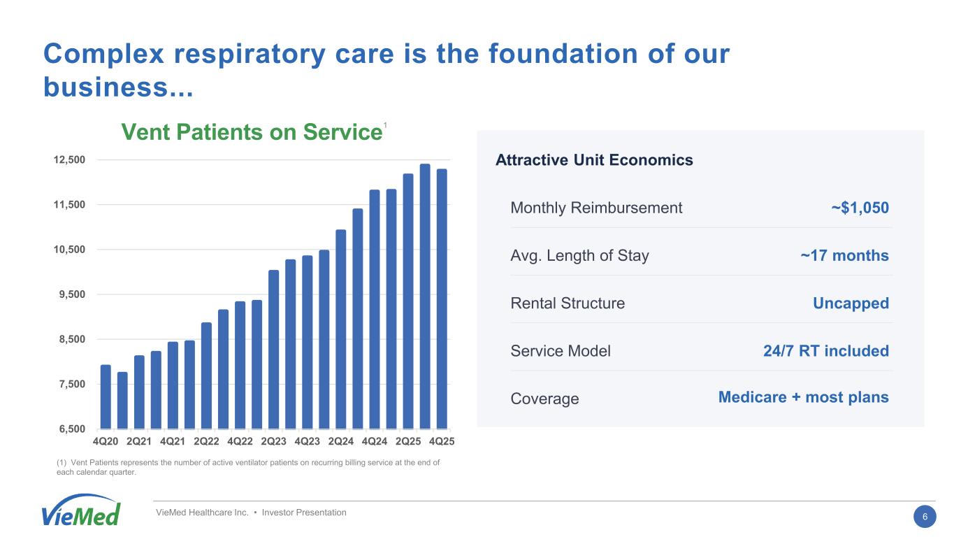 ...with multiple catalysts driving our growth. 5 VieMed Healthcare Inc. • Investor Presentation Massively underserved market with a purpose-built clinical model to close the gap Complex respiratory care and obstructive sleep apnea remain meaningfully underdiagnosed and undertreated. VieMed's high-touch, technology-enabled approach is designed to reach patients where traditional providers cannot. A vital link between patients, providers, and payors with measurable outcomes Our clinical care model improves patient compliance, reduces hospitalizations, and drives payer value. Designed to create lasting relationships and a defensible competitive position. Proven growth platform with a broadening service mix Organic and inorganic expansion has diversified VieMed well beyond our ventilation roots. Our entry into maternal health is the most recent example of leveraging shared infrastructure for capital-light growth into adjacent markets. Regulatory tailwinds favor our model The shift toward home-based care, efficiency, compliance, and transparency plays directly to VieMed's strengths. We are uniquely positioned to succeed in this environment.