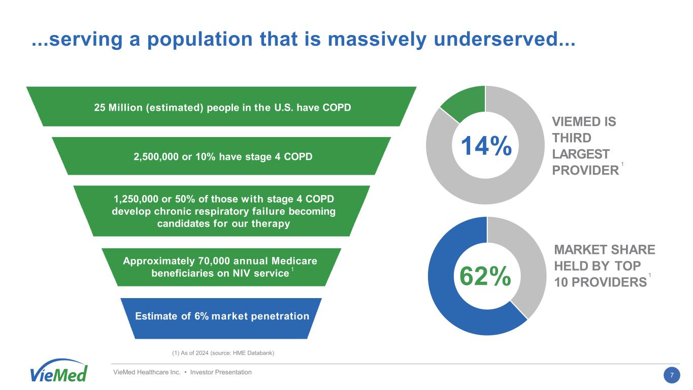 Complex respiratory care is the foundation of our business... VieMed Healthcare Inc. • Investor Presentation Vent Patients on Service 6,500 7,500 8,500 9,500 10,500 11,500 12,500 4Q20 2Q21 4Q21 2Q22 4Q22 2Q23 4Q23 2Q24 4Q24 2Q25 4Q25 1 (1) Vent Patients represents the number of active ventilator patients on recurring billing service at the end of each calendar quarter. 6 Attractive Unit Economics Monthly Reimbursement ~$1,050 Avg. Length of Stay ~17 months Rental Structure Uncapped Service Model 24/7 RT included Coverage Medicare + most plans