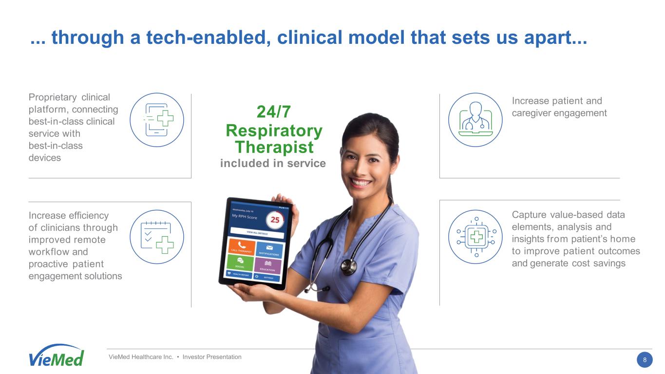 ...serving a population that is massively underserved... (1) As of 2024 (source: HME Databank) VieMed Healthcare Inc. • Investor Presentation 25 Million (estimated) people in the U.S. have COPD Approximately 70,000 annual Medicare beneficiaries on NIV service Estimate of 6% market penetration 2,500,000 or 10% have stage 4 COPD 1,250,000 or 50% of those with stage 4 COPD develop chronic respiratory failure becoming candidates for our therapy VIEMED IS THIRD LARGEST PROVIDER MARKET SHARE HELD BY TOP 10 PROVIDERS 14% 62% 7 1 1 1