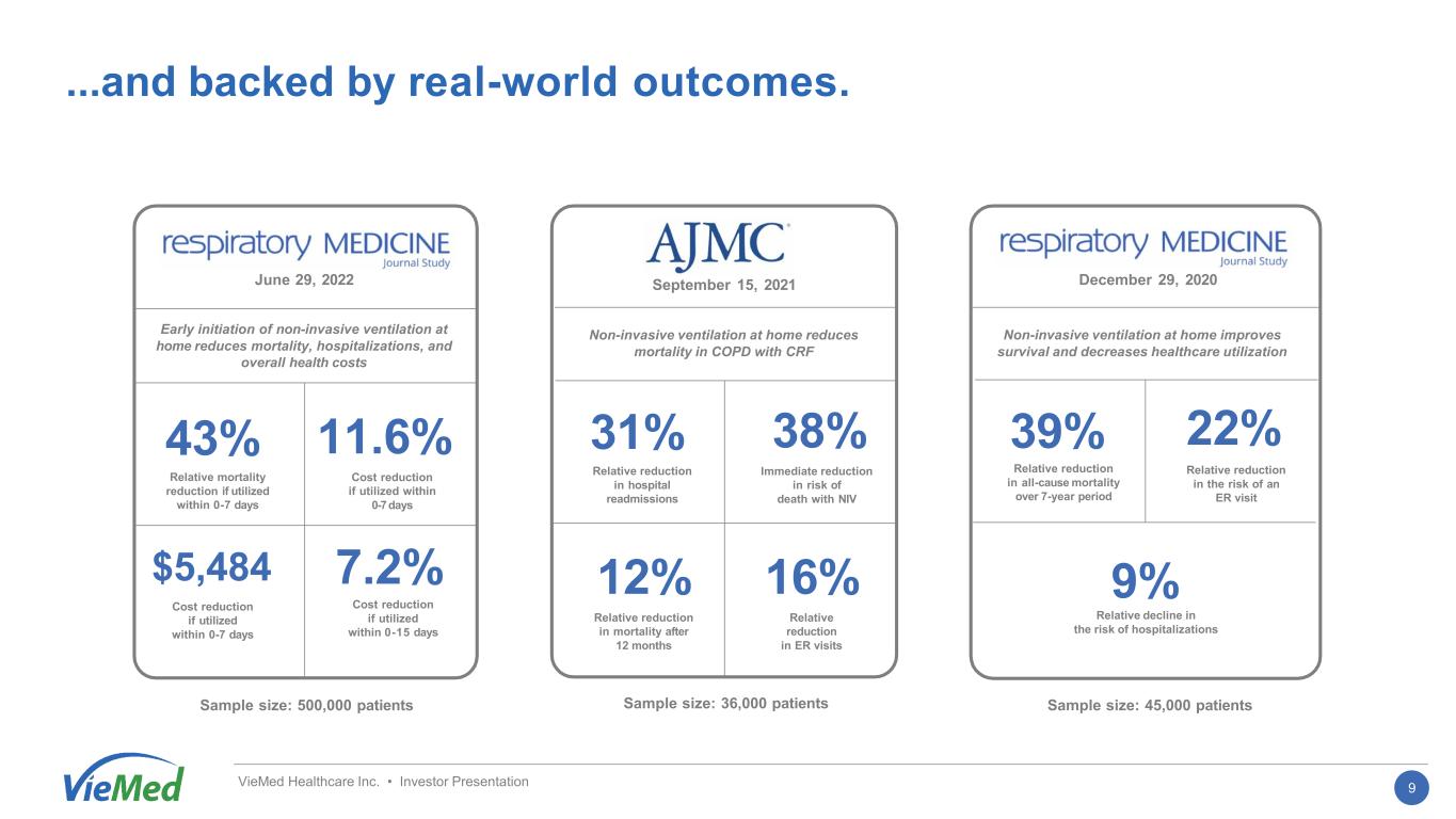 ...and backed by real-world outcomes. VieMed Healthcare Inc. • Investor Presentation Non-invasive ventilation at home reduces mortality in COPD with CRF September 15, 2021 December 29, 2020June 29, 2022 Sample size: 500,000 patients Sample size: 36,000 patients Sample size: 45,000 patients 43% Relative mortality reduction if utilized within 0-7 days 11.6% Cost reduction if utilized within 0-7 days 7.2% Cost reduction if utilized within 0-15 days $5,484 Cost reduction if utilized within 0-7 days Early initiation of non-invasive ventilation at home reduces mortality, hospitalizations, and overall health costs Non-invasive ventilation at home reduces mortality in COPD with CRF 31% Relative reduction in hospital readmissions 38% Immediate reduction in risk of death with NIV 12% Relative reduction in mortality after 12 months 16% Relative reduction in ER visits Non-invasive ventilation at home improves survival and decreases healthcare utilization 39% Relative reduction in all-cause mortality over 7-year period 9% Relative decline in the risk of hospitalizations 22% Relative reduction in the risk of an ER visit 9