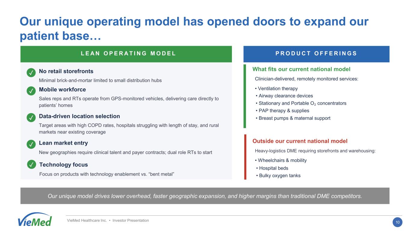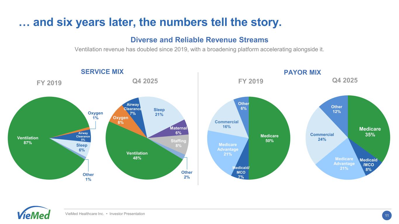 Our unique operating model has opened doors to expand our patient base… VieMed Healthcare Inc. • Investor Presentation 10 L E A N O P E R A T I N G M O D E L ✓ No retail storefronts Minimal brick-and-mortar limited to small distribution hubs ✓ Mobile workforce Sales reps and RTs operate from GPS-monitored vehicles, delivering care directly to patients’ homes ✓ Data-driven location selection Target areas with high COPD rates, hospitals struggling with length of stay, and rural markets near existing coverage ✓ Lean market entry New geographies require clinical talent and payer contracts; dual role RTs to start P R O D U C T O F F E R I N G S What fits our current national model Clinician-delivered, remotely monitored services: • Ventilation therapy • PAP therapy & supplies • Breast pumps & maternal support • Stationary and Portable O₂ concentrators • Airway clearance devices Outside our current national model Heavy-logistics DME requiring storefronts and warehousing: • Wheelchairs & mobility • Hospital beds • Bulky oxygen tanks Our unique model drives lower overhead, faster geographic expansion, and higher margins than traditional DME competitors. ✓ Technology focus Focus on products with technology enablement vs. “bent metal” ✓