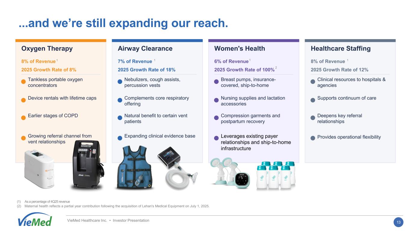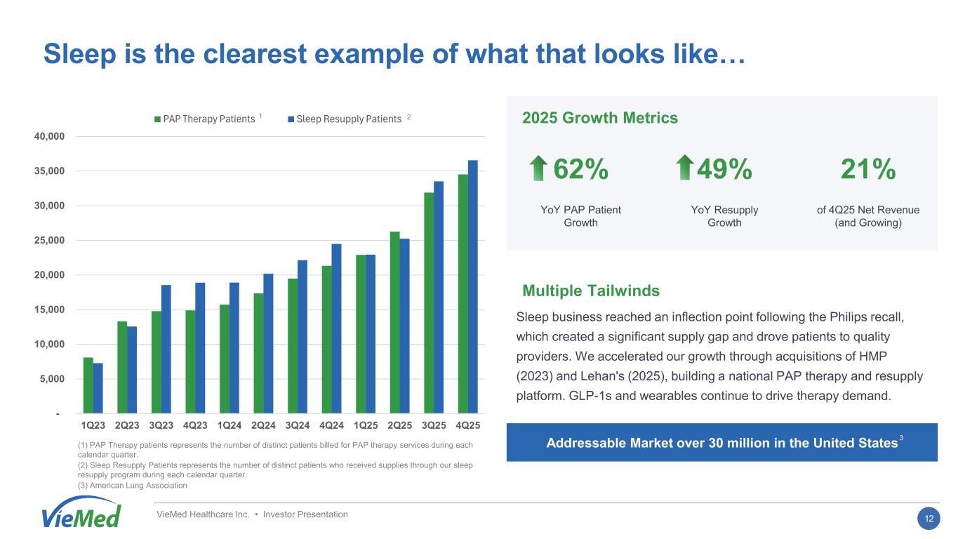 - 5,000 10,000 15,000 20,000 25,000 30,000 35,000 40,000 1Q23 2Q23 3Q23 4Q23 1Q24 2Q24 3Q24 4Q24 1Q25 2Q25 3Q25 4Q25 PAP Therapy Patients Sleep Resupply Patients VieMed Healthcare Inc. • Investor Presentation (1) PAP Therapy patients represents the number of distinct patients billed for PAP therapy services during each calendar quarter. (2) Sleep Resupply Patients represents the number of distinct patients who received supplies through our sleep resupply program during each calendar quarter. (3) American Lung Association 1 2 12 Sleep is the clearest example of what that looks like… 62% YoY PAP Patient Growth 49% YoY Resupply Growth 21% of 4Q25 Net Revenue (and Growing) Multiple Tailwinds Sleep business reached an inflection point following the Philips recall, which created a significant supply gap and drove patients to quality providers. We accelerated our growth through acquisitions of HMP (2023) and Lehan's (2025), building a national PAP therapy and resupply platform. GLP-1s and wearables continue to drive therapy demand. Addressable Market over 30 million in the United States 2025 Growth Metrics 3