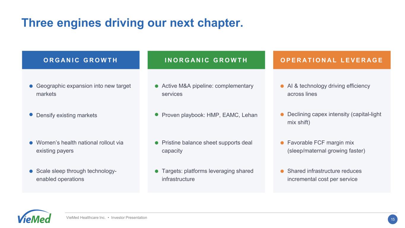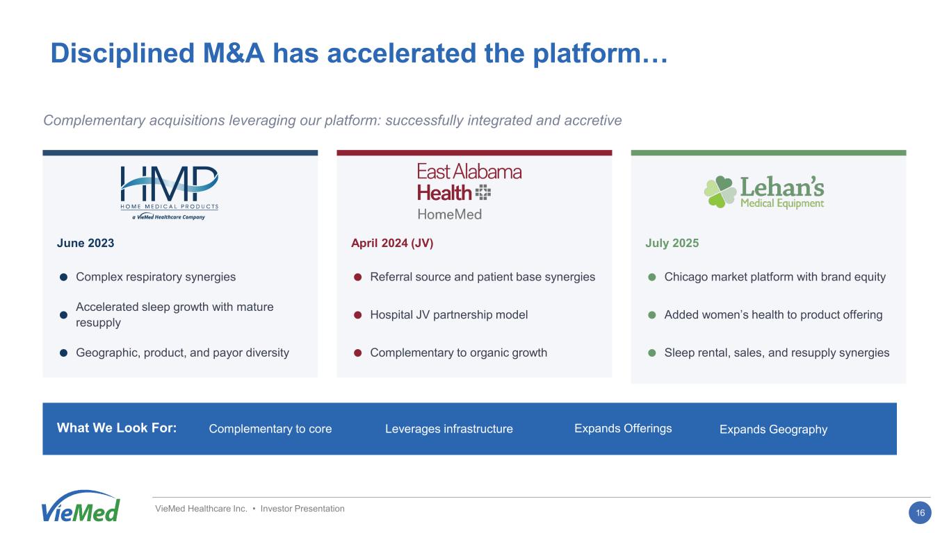 VieMed Healthcare Inc. • Investor Presentation 15 Three engines driving our next chapter. O R G A N I C G R O W T H Geographic expansion into new target markets Densify existing markets Women’s health national rollout via existing payers Scale sleep through technology- enabled operations I N O R G A N I C G R O W T H Active M&A pipeline: complementary services Proven playbook: HMP, EAMC, Lehan Pristine balance sheet supports deal capacity Targets: platforms leveraging shared infrastructure O P E R A T I O N A L L E V E R A G E AI & technology driving efficiency across lines Declining capex intensity (capital-light mix shift) Favorable FCF margin mix (sleep/maternal growing faster) Shared infrastructure reduces incremental cost per service