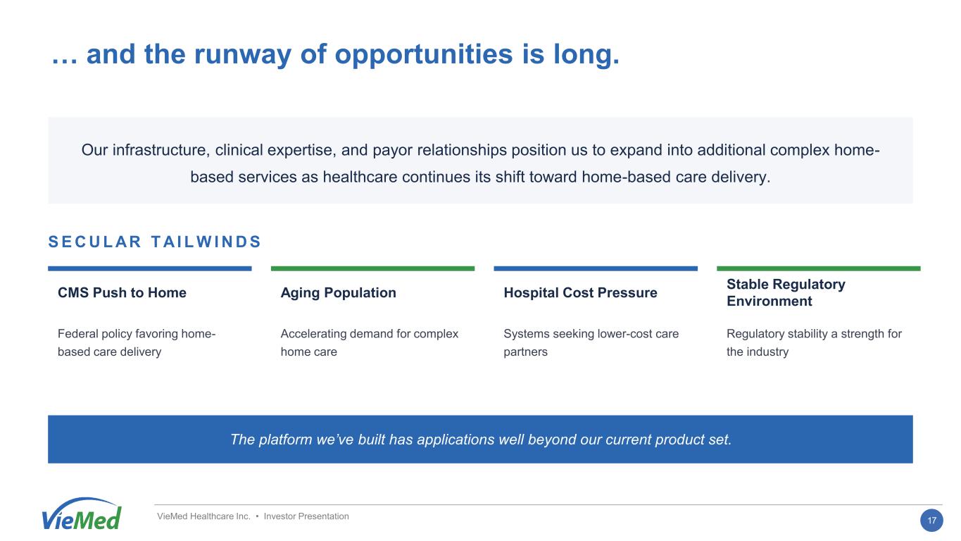 VieMed Healthcare Inc. • Investor Presentation 16 Disciplined M&A has accelerated the platform… Complementary acquisitions leveraging our platform: successfully integrated and accretive June 2023 Complex respiratory synergies Accelerated sleep growth with mature resupply Geographic, product, and payor diversity April 2024 (JV) Referral source and patient base synergies Hospital JV partnership model Complementary to organic growth July 2025 Chicago market platform with brand equity Added women’s health to product offering Sleep rental, sales, and resupply synergies What We Look For: Complementary to core Leverages infrastructure Expands Offerings Expands Geography