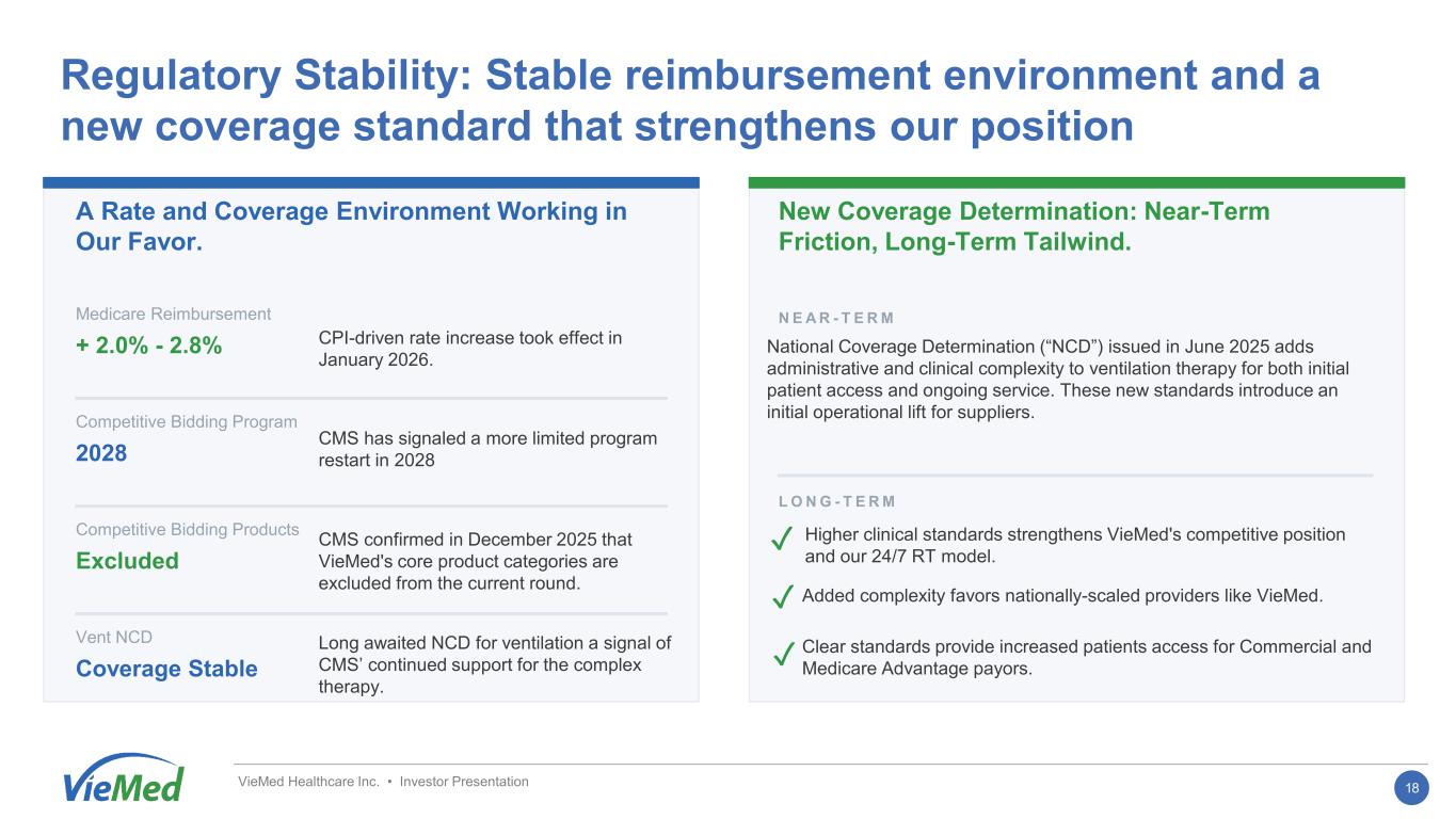 VieMed Healthcare Inc. • Investor Presentation 13 ...and we’re still expanding our reach. Oxygen Therapy 8% of Revenue 2025 Growth Rate of 8% Tankless portable oxygen concentrators Device rentals with lifetime caps Earlier stages of COPD Growing referral channel from vent relationships Airway Clearance 7% of Revenue 2025 Growth Rate of 18% Nebulizers, cough assists, percussion vests Complements core respiratory offering Natural benefit to certain vent patients Expanding clinical evidence base Women's Health 6% of Revenue 2025 Growth Rate of 100% Breast pumps, insurance- covered, ship-to-home Nursing supplies and lactation accessories Compression garments and postpartum recovery Leverages existing payer relationships and ship-to-home infrastructure Healthcare Staffing 8% of Revenue 2025 Growth Rate of 12% Clinical resources to hospitals & agencies Supports continuum of care Deepens key referral relationships Provides operational flexibility (1) As a percentage of 4Q25 revenue (2) Maternal health reflects a partial year contribution following the acquisition of Lehan's Medical Equipment on July 1, 2025. 1 1 1 1 2