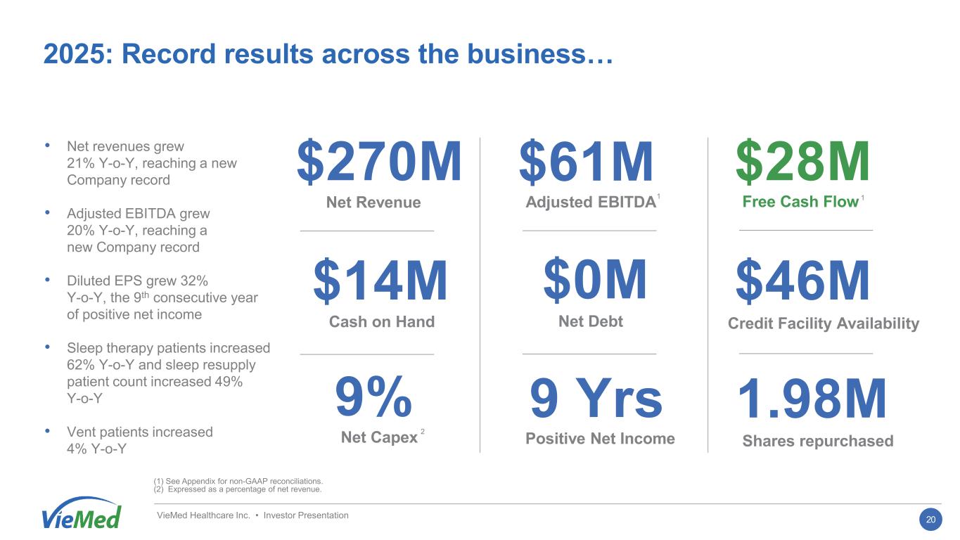 • Net revenues grew 21% Y-o-Y, reaching a new Company record • Adjusted EBITDA grew 20% Y-o-Y, reaching a new Company record • Diluted EPS grew 32% Y-o-Y, the 9th consecutive year of positive net income • Sleep therapy patients increased 62% Y-o-Y and sleep resupply patient count increased 49% Y-o-Y • Vent patients increased 4% Y-o-Y VieMed Healthcare Inc. • Investor Presentation $270M Net Revenue $61M Adjusted EBITDA $28M Free Cash Flow $14M Cash on Hand $0M Net Debt $46M Credit Facility Availability 9% Net Capex 9 Yrs Positive Net Income (1) See Appendix for non-GAAP reconciliations. (2) Expressed as a percentage of net revenue. 1 1 20 2025: Record results across the business… 2 1.98M Shares repurchased