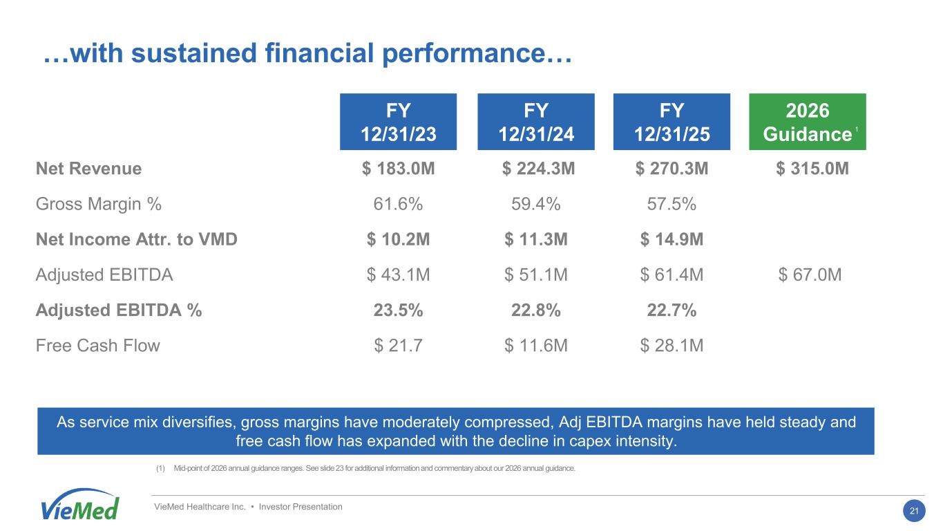VieMed Healthcare Inc. • Investor Presentation 21 …with sustained financial performance… FY 12/31/23 FY 12/31/24 FY 12/31/25 2026 Guidance Net Revenue $ 183.0M $ 224.3M $ 270.3M $ 315.0M Gross Margin % 61.6% 59.4% 57.5% Net Income Attr. to VMD $ 10.2M $ 11.3M $ 14.9M Adjusted EBITDA $ 43.1M $ 51.1M $ 61.4M $ 67.0M Adjusted EBITDA % 23.5% 22.8% 22.7% Free Cash Flow $ 21.7 $ 11.6M $ 28.1M As service mix diversifies, gross margins have moderately compressed, Adj EBITDA margins have held steady and free cash flow has expanded with the decline in capex intensity. 1 (1) Mid-point of 2026 annual guidance ranges. See slide 23 for additional information and commentary about our 2026 annual guidance.