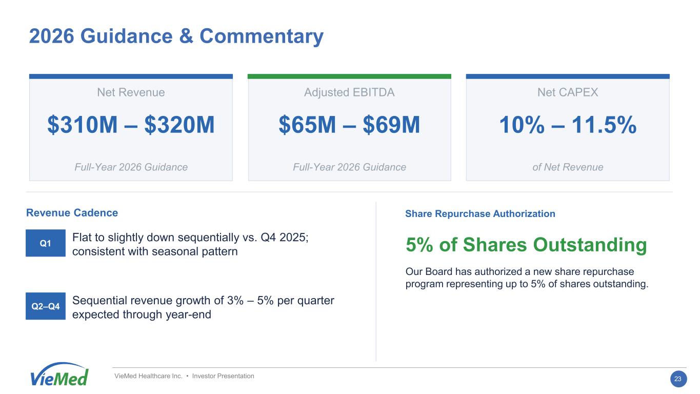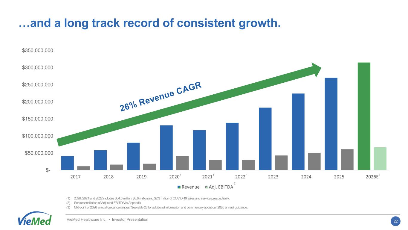 VieMed Healthcare Inc. • Investor Presentation $- $50,000,000 $100,000,000 $150,000,000 $200,000,000 $250,000,000 $300,000,000 $350,000,000 2017 2018 2019 2020 2021 2022 2023 2024 2025 2026E Revenue Adj. EBITDA (1) 2020, 2021 and 2022 includes $34.3 million, $8.6 million and $2.3 million of COVID-19 sales and services, respectively. (2) See reconciliation of Adjusted EBITDA in Appendix. (3) Mid-point of 2026 annual guidance ranges. See slide 23 for additional information and commentary about our 2026 annual guidance. 1 1 1 3 2 22 …and a long track record of consistent growth.