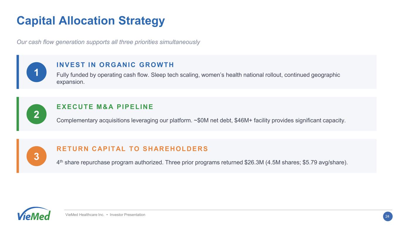 Capital Allocation Strategy 24VieMed Healthcare Inc. • Investor Presentation Our cash flow generation supports all three priorities simultaneously 1 INVEST IN ORGANIC GROWTH Fully funded by operating cash flow. Sleep tech scaling, women’s health national rollout, continued geographic expansion. 2 EXECUTE M&A P IPELINE Complementary acquisitions leveraging our platform. ~$0M net debt, $46M+ facility provides significant capacity. 3 RETURN CAPITAL TO SHAREHOLDERS 4th share repurchase program authorized. Three prior programs returned $26.3M (4.5M shares; $5.79 avg/share).