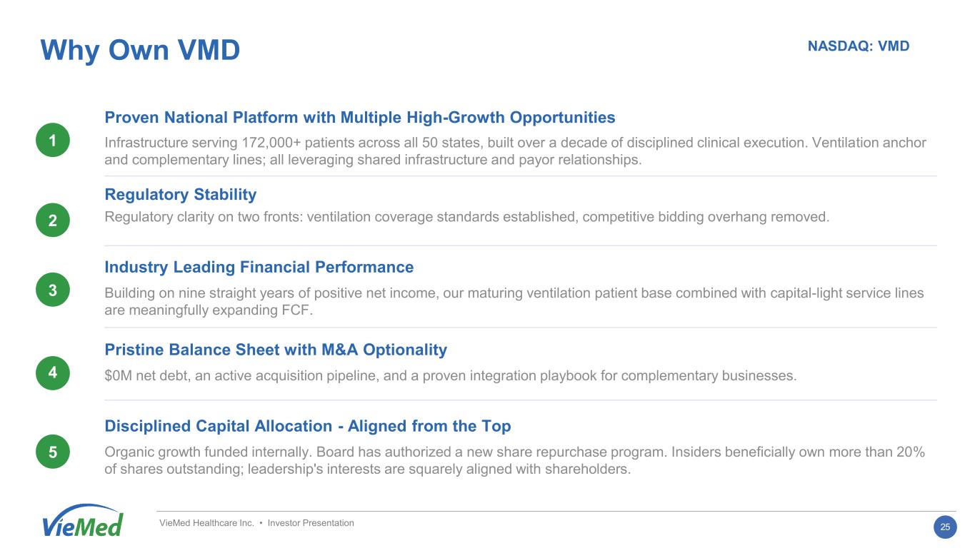 Why Own VMD 25VieMed Healthcare Inc. • Investor Presentation 1 Proven National Platform with Multiple High-Growth Opportunities Infrastructure serving 172,000+ patients across all 50 states, built over a decade of disciplined clinical execution. Ventilation anchor and complementary lines; all leveraging shared infrastructure and payor relationships. 2 Regulatory Stability 3 Industry Leading Financial Performance Building on nine straight years of positive net income, our maturing ventilation patient base combined with capital-light service lines are meaningfully expanding FCF. 4 Pristine Balance Sheet with M&A Optionality $0M net debt, an active acquisition pipeline, and a proven integration playbook for complementary businesses. 5 Disciplined Capital Allocation - Aligned from the Top Organic growth funded internally. Board has authorized a new share repurchase program. Insiders beneficially own more than 20% of shares outstanding; leadership's interests are squarely aligned with shareholders. NASDAQ: VMD Regulatory clarity on two fronts: ventilation coverage standards established, competitive bidding overhang removed.