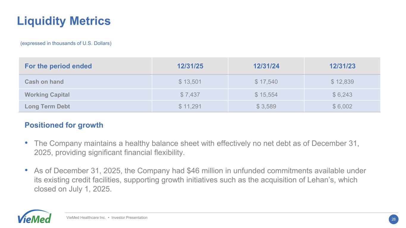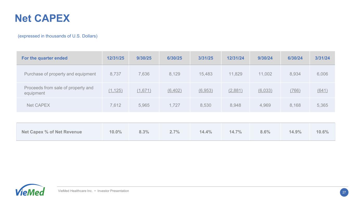 Net CAPEX For the quarter ended 12/31/25 9/30/25 6/30/25 3/31/25 12/31/24 9/30/24 6/30/24 3/31/24 Purchase of property and equipment 8,737 7,636 8,129 15,483 11,829 11,002 8,934 6,006 Proceeds from sale of property and equipment (1,125) (1,671) (6,402) (6,953) (2,881) (6,033) (766) (641) Net CAPEX 7,612 5,965 1,727 8,530 8,948 4,969 8,168 5,365 Net Capex % of Net Revenue 10.0% 8.3% 2.7% 14.4% 14.7% 8.6% 14.9% 10.6% VieMed Healthcare Inc. • Investor Presentation (expressed in thousands of U.S. Dollars) 27