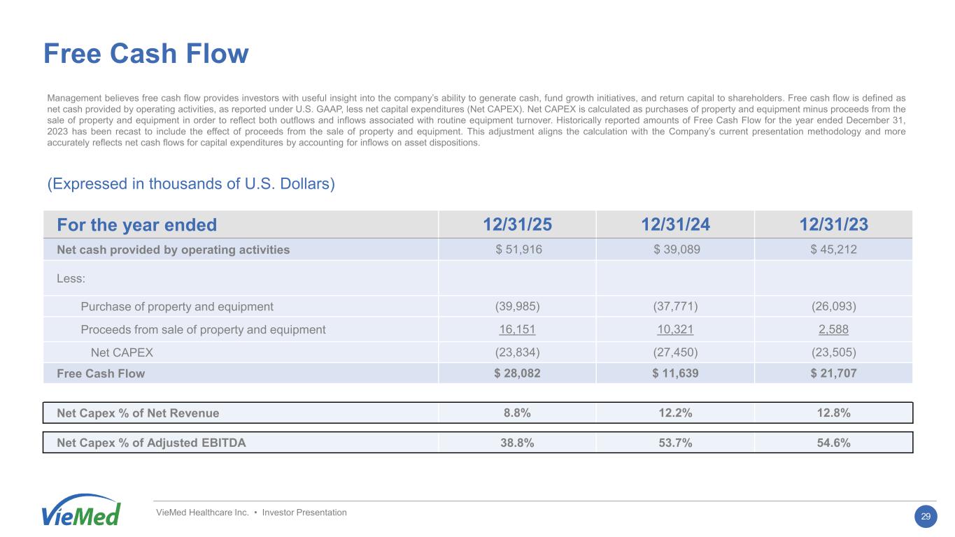 For the year ended 12/31/25 12/31/24 12/31/23 Net cash provided by operating activities $ 51,916 $ 39,089 $ 45,212 Less: Purchase of property and equipment (39,985) (37,771) (26,093) Proceeds from sale of property and equipment 16,151 10,321 2,588 Net CAPEX (23,834) (27,450) (23,505) Free Cash Flow $ 28,082 $ 11,639 $ 21,707 Net Capex % of Net Revenue 8.8% 12.2% 12.8% Net Capex % of Adjusted EBITDA 38.8% 53.7% 54.6% Free Cash Flow VieMed Healthcare Inc. • Investor Presentation Management believes free cash flow provides investors with useful insight into the company’s ability to generate cash, fund growth initiatives, and return capital to shareholders. Free cash flow is defined as net cash provided by operating activities, as reported under U.S. GAAP, less net capital expenditures (Net CAPEX). Net CAPEX is calculated as purchases of property and equipment minus proceeds from the sale of property and equipment in order to reflect both outflows and inflows associated with routine equipment turnover. Historically reported amounts of Free Cash Flow for the year ended December 31, 2023 has been recast to include the effect of proceeds from the sale of property and equipment. This adjustment aligns the calculation with the Company’s current presentation methodology and more accurately reflects net cash flows for capital expenditures by accounting for inflows on asset dispositions. (Expressed in thousands of U.S. Dollars) 29