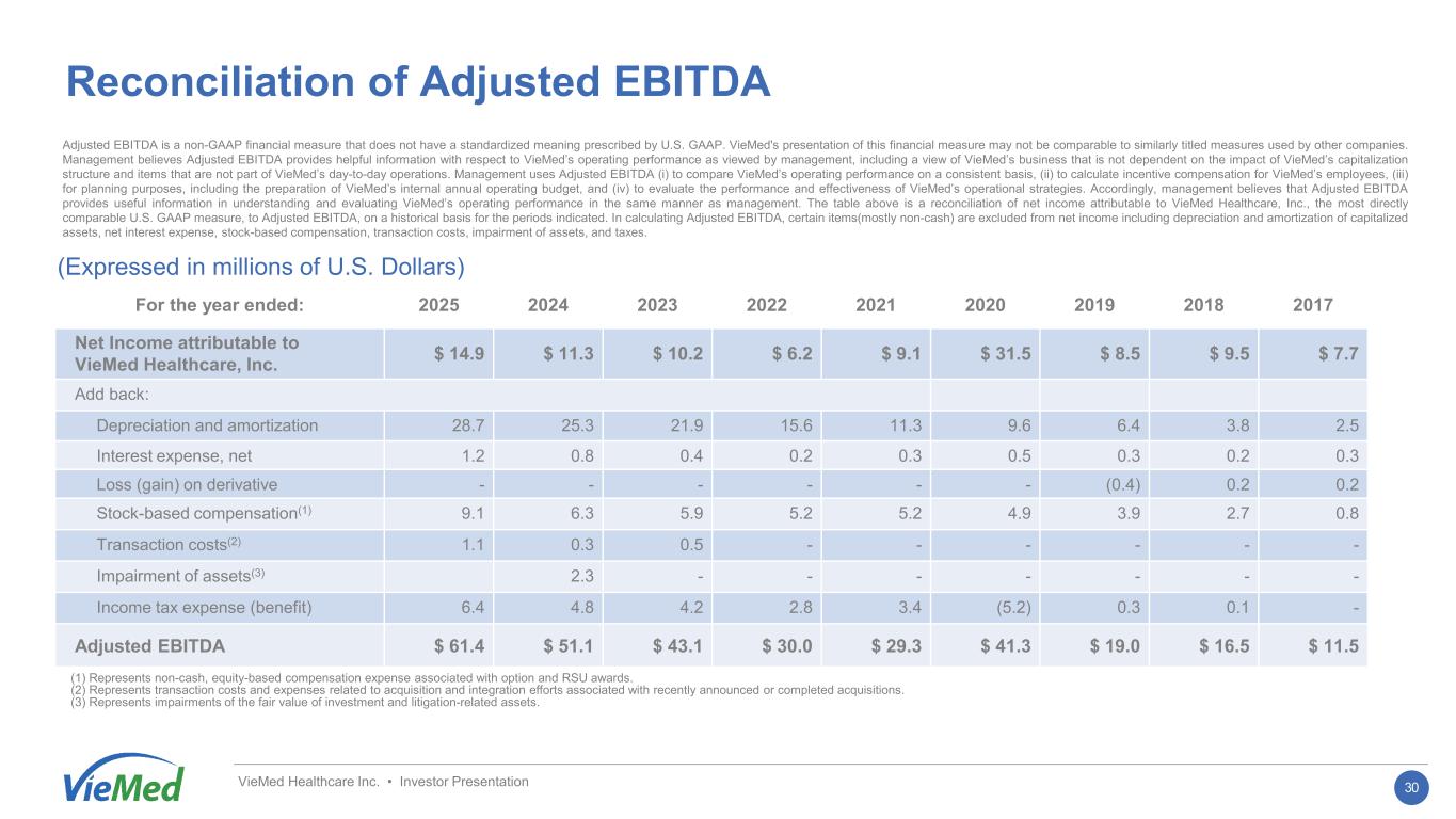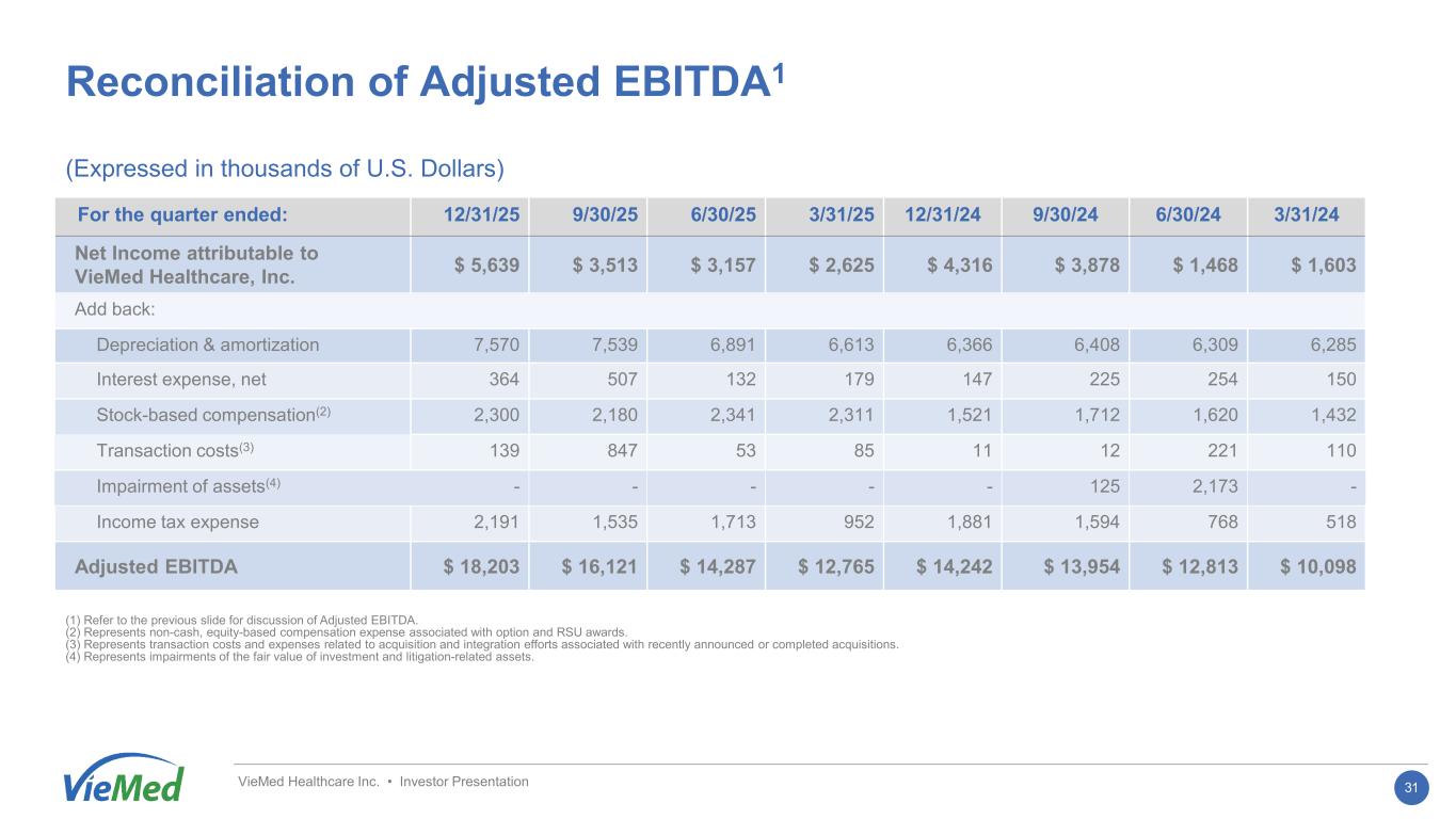 Reconciliation of Adjusted EBITDA (1) Represents non-cash, equity-based compensation expense associated with option and RSU awards. (2) Represents transaction costs and expenses related to acquisition and integration efforts associated with recently announced or completed acquisitions. (3) Represents impairments of the fair value of investment and litigation-related assets. (Expressed in millions of U.S. Dollars) For the year ended: 2025 2024 2023 2022 2021 2020 2019 2018 2017 Net Income attributable to VieMed Healthcare, Inc. $ 14.9 $ 11.3 $ 10.2 $ 6.2 $ 9.1 $ 31.5 $ 8.5 $ 9.5 $ 7.7 Add back: Depreciation and amortization 28.7 25.3 21.9 15.6 11.3 9.6 6.4 3.8 2.5 Interest expense, net 1.2 0.8 0.4 0.2 0.3 0.5 0.3 0.2 0.3 Loss (gain) on derivative - - - - - - (0.4) 0.2 0.2 Stock-based compensation(1) 9.1 6.3 5.9 5.2 5.2 4.9 3.9 2.7 0.8 Transaction costs(2) 1.1 0.3 0.5 - - - - - - Impairment of assets(3) 2.3 - - - - - - - Income tax expense (benefit) 6.4 4.8 4.2 2.8 3.4 (5.2) 0.3 0.1 - Adjusted EBITDA $ 61.4 $ 51.1 $ 43.1 $ 30.0 $ 29.3 $ 41.3 $ 19.0 $ 16.5 $ 11.5 VieMed Healthcare Inc. • Investor Presentation Adjusted EBITDA is a non-GAAP financial measure that does not have a standardized meaning prescribed by U.S. GAAP. VieMed's presentation of this financial measure may not be comparable to similarly titled measures used by other companies. Management believes Adjusted EBITDA provides helpful information with respect to VieMed’s operating performance as viewed by management, including a view of VieMed’s business that is not dependent on the impact of VieMed’s capitalization structure and items that are not part of VieMed’s day-to-day operations. Management uses Adjusted EBITDA (i) to compare VieMed’s operating performance on a consistent basis, (ii) to calculate incentive compensation for VieMed’s employees, (iii) for planning purposes, including the preparation of VieMed’s internal annual operating budget, and (iv) to evaluate the performance and effectiveness of VieMed’s operational strategies. Accordingly, management believes that Adjusted EBITDA provides useful information in understanding and evaluating VieMed’s operating performance in the same manner as management. The table above is a reconciliation of net income attributable to VieMed Healthcare, Inc., the most directly comparable U.S. GAAP measure, to Adjusted EBITDA, on a historical basis for the periods indicated. In calculating Adjusted EBITDA, certain items(mostly non-cash) are excluded from net income including depreciation and amortization of capitalized assets, net interest expense, stock-based compensation, transaction costs, impairment of assets, and taxes. 30