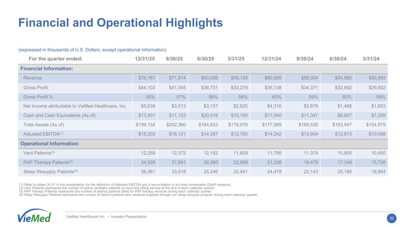 VieMed Healthcare Inc. • Investor Presentation Financial and Operational Highlights (expressed in thousands of U.S. Dollars, except operational information). (1) Refer to slides 30-31 in this presentation for the definition of Adjusted EBITDA and a reconciliation to its most comparable GAAP measure. (2) Vent Patients represents the number of active ventilator patients on recurring billing service at the end of each calendar quarter. (3) PAP Therapy Patients represents the number of distinct patients billed for PAP therapy services during each calendar quarter. (4) Sleep Resupply Patients represents the number of distinct patients who received supplies through our sleep resupply program during each calendar quarter. For the quarter ended: 12/31/25 9/30/25 6/30/25 3/31/25 12/31/24 9/30/24 6/30/24 3/31/24 Financial Information: Revenue $76,181 $71,914 $63,056 $59,129 $60,695 $58,004 $54,965 $50,593 Gross Profit $44,103 $41,345 $36,731 $33,279 $36,138 $34,371 $32,892 $29,802 Gross Profit % 58% 57% 58% 56% 60% 59% 60% 59% Net Income attributable to VieMed Healthcare, Inc. $5,639 $3,513 $3,157 $2,625 $4,316 $3,878 $1,468 $1,603 Cash and Cash Equivalents (As of) $13,501 $11,123 $20,016 $10,160 $17,540 $11,347 $8,807 $7,309 Total Assets (As of) $199,154 $202,360 $184,603 $178,079 $177,069 $169,526 $163,947 $154,875 Adjusted EBITDA(1) $18,203 $16,121 $14,287 $12,765 $14,242 $13,954 $12,813 $10,098 Operational Information: Vent Patients(2) 12,259 12,372 12,152 11,809 11,795 11,374 10,905 10,450 PAP Therapy Patients(3) 34,528 31,891 26,260 22,899 21,338 19,478 17,349 15,726 Sleep Resupply Patients(4) 36,561 33,518 25,246 22,941 24,478 22,143 20,185 18,904 32
