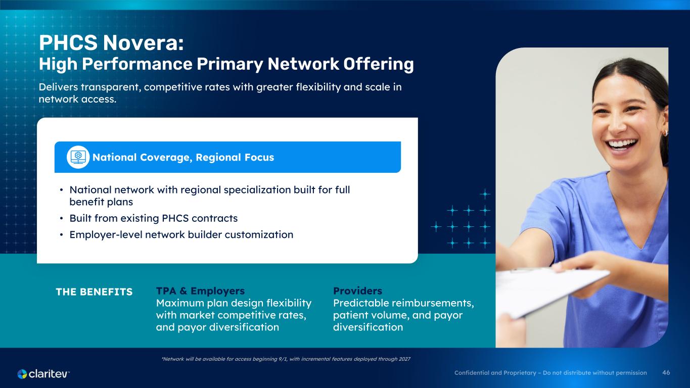 Confidential and Proprietary – Do not distribute without permission 45 Claims Intelligence Network Payment & Revenue Integrity Data & Analytics 2026 Innovation & Solutions Roadmap New Solutions | Market Entry New Features | Enhancements Claims Optimizer (UAE) Technology Alpha Release of Marketplace and Developer Hub w/ 2 APIs In-House Member Concierge Pro Pricer® – without Reference Based Pricing (RBP) NSA Ceiling Predictive Model Tooling Partnership Integration +2 APIs & Data Extracts +2 APIs & Data Extracts ValuePoint API - Facility Rates - Alpha PHCS Novera: expansion, mobile app, in-house conciergePHCS Novera Enhanced briefs to include facility quality data IDR Brief Automation ACE (KSA) MA Network - NaaS Ground Ambulance PricingData iSight Methodology Enhanced Member App - UI/UX & Access to Care Indicator GA +2 APIs & Data Extracts Client Reporting – Open & Closed PAC Client Custom NetworksValuePoint expansion Next-Gen Pre-Pay Platform – AI Enabled Vistara Point Solution TPA/Broker Partner Program IBR Review – AI Enabled Predictive AI Offer EngineState Reg Ground Ambulance DIS Expand NSA Insights Portal to Vistara clients ACE API for Klaim (USA) Member App - UI/UX & Provider Search Results Member App - Usage Tracking & Follow-up Messaging BenInsights UX Modernization CompleteVue Quality Analytics Alpha BenInsights Opportunities Module descriptive summaries (AI) BenInsights Simplified UX w/ Advisory (Kinetiq) for Employers PlanOptix: Freeview CompleteVue Pricing Analytics: Hospital Rate Trends PlanOptix Health System Level Comparison CompleteVue Quality Analytics Beta BenInsights TPA Segment Entry BenInsights HCM Fusion integration (Beta-Claritev) CompleteVue Operational Analytics- Alpha CompleteVue Health System Level Comparison Professional Services version 26.Q1.V2 AI Provider Contact Research API for surprise bill claims and EOP data Client Reporting – Client ConfigClient Reporting – Annual Reports PlanOptix & CompleteVue: Market Benchmark Rates DRG-V Pre-Pay Complex PI Reviews Automate Buyer Workflows, Provisioning, and Entitlement Q4 2026Q3 2026Q2 2026Q1 2026 30+ new features/ enhancement 18+ new solutions