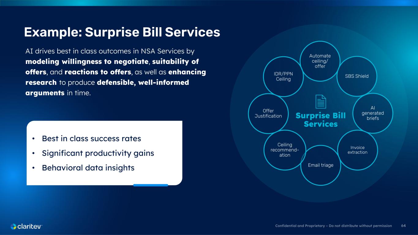 Confidential and Proprietary – Do not distribute without permission 64 Surprise Bill Services Automate ceiling/ offer SBS Shield AI generated briefs Invoice extraction Email triage Ceiling recommend- ation Offer Justification IDR/PPN Ceiling • Best in class success rates • Significant productivity gains • Behavioral data insights Example: Surprise Bill Services AI drives best in class outcomes in NSA Services by modeling willingness to negotiate, suitability of offers, and reactions to offers, as well as enhancing research to produce defensible, well-informed arguments in time.