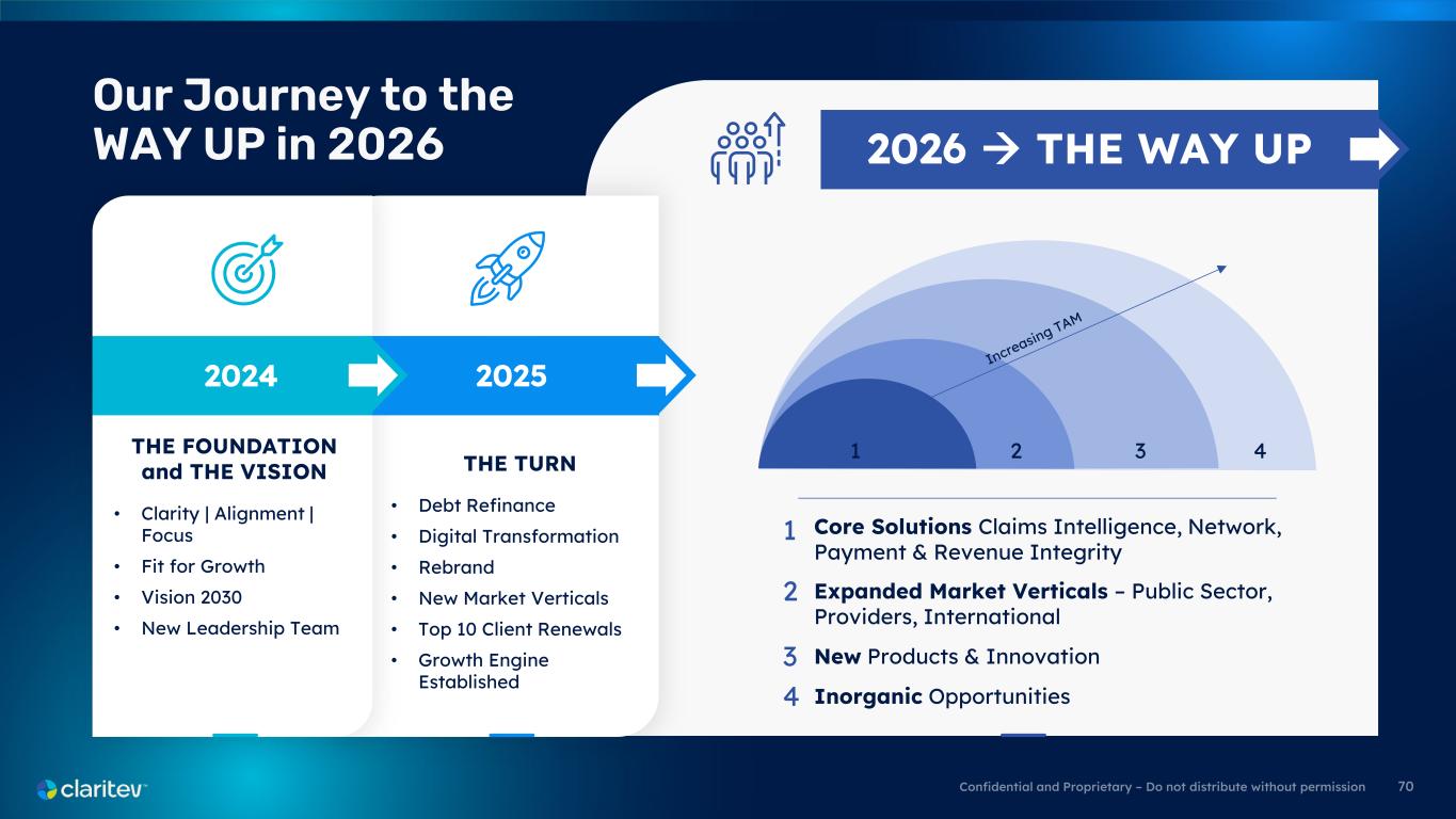 Confidential and Proprietary – Do not distribute without permission 70 Our Journey to the WAY UP in 2026 THE FOUNDATION and THE VISION • Clarity | Alignment | Focus • Fit for Growth • Vision 2030 • New Leadership Team THE TURN • Debt Refinance • Digital Transformation • Rebrand • New Market Verticals • Top 10 Client Renewals • Growth Engine Established 2024 2025 1 Core Solutions Claims Intelligence, Network, Payment & Revenue Integrity 2 Expanded Market Verticals – Public Sector, Providers, International 3 New Products & Innovation 4 Inorganic Opportunities 1 2 3 4 2026 THE WAY UP