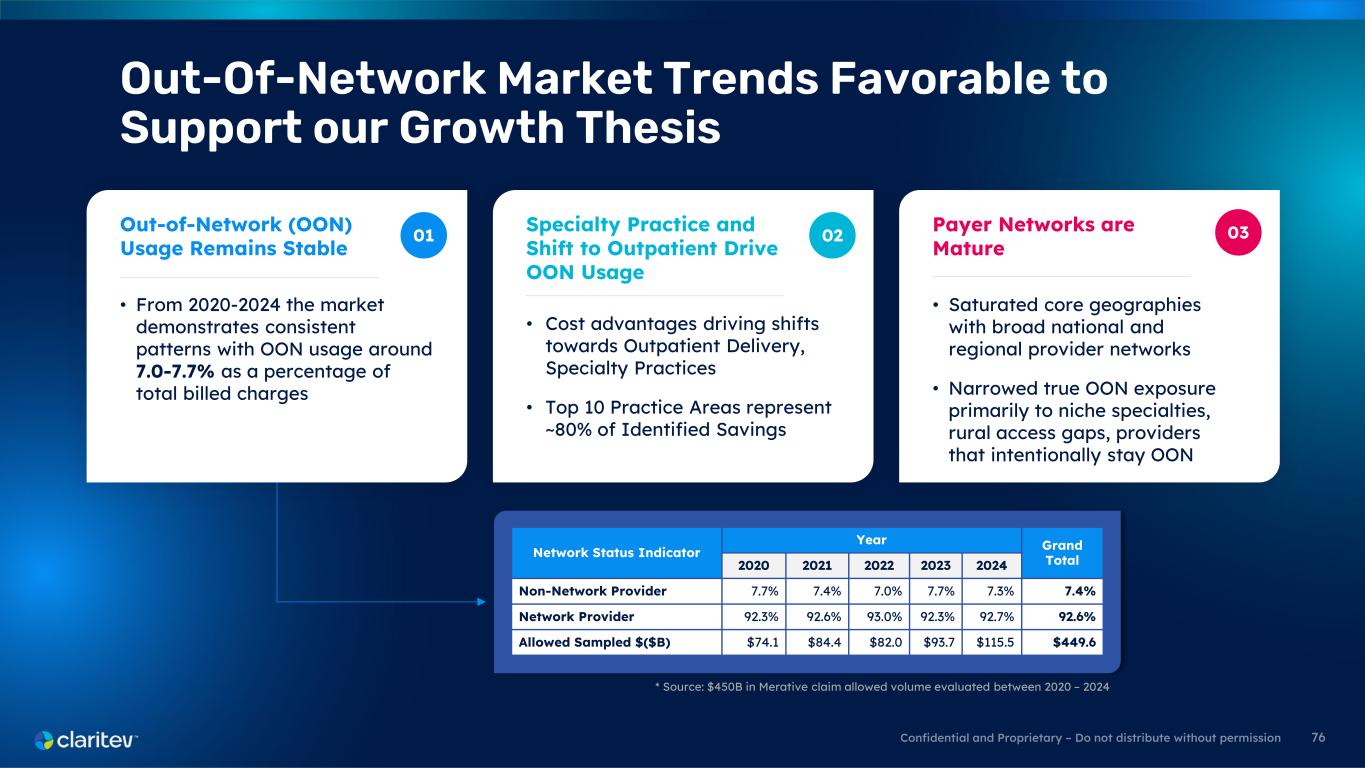 Confidential and Proprietary – Do not distribute without permission 76 Out-Of-Network Market Trends Favorable to Support our Growth Thesis • From 2020-2024 the market demonstrates consistent patterns with OON usage around 7.0-7.7% as a percentage of total billed charges Out-of-Network (OON) Usage Remains Stable • Cost advantages driving shifts towards Outpatient Delivery, Specialty Practices • Top 10 Practice Areas represent ~80% of Identified Savings Specialty Practice and Shift to Outpatient Drive OON Usage • Saturated core geographies with broad national and regional provider networks • Narrowed true OON exposure primarily to niche specialties, rural access gaps, providers that intentionally stay OON Payer Networks are Mature Network Status Indicator Year Grand Total2020 2021 2022 2023 2024 Non-Network Provider 7.7% 7.4% 7.0% 7.7% 7.3% 7.4% Network Provider 92.3% 92.6% 93.0% 92.3% 92.7% 92.6% Allowed Sampled $($B) $74.1 $84.4 $82.0 $93.7 $115.5 $449.6 * Source: $450B in Merative claim allowed volume evaluated between 2020 – 2024 01 02 03