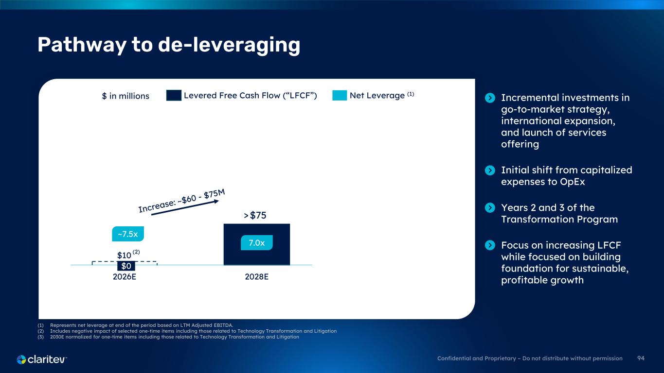 Confidential and Proprietary – Do not distribute without permission 94 $75 $225 2026E 2028E 2030E Pathway to de-leveraging Levered Free Cash Flow (“LFCF”) Net Leverage (1) Incremental investments in go-to-market strategy, international expansion, and launch of services offering Initial shift from capitalized expenses to OpEx Years 2 and 3 of the Transformation Program Focus on increasing LFCF while focused on building foundation for sustainable, profitable growth $ in millions (1) Represents net leverage at end of the period based on LTM Adjusted EBITDA. (2) Includes negative impact of selected one-time items including those related to Technology Transformation and Litigation (3) 2030E normalized for one-time items including those related to Technology Transformation and Litigation 7.0x (3) (2) ~5.0x $10 ~7.5x $0 (3)> >
