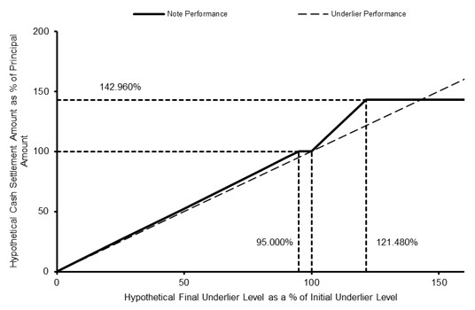 The following chart shows a graphical illustration of the hypothetical cash settlement amounts (expressed as percentages of the principal amount of your notes) that we would pay on your notes on the stated maturity date, if the final underlier level (expressed as percentages of the initial underlier level) were any of the hypothetical levels shown on the horizontal axis. The chart shows that any hypothetical final underlier level of less than 95.000% (the section left of the 95.000% marker on the horizontal axis) would result in a hypothetical cash settlement amount of less than 100.000% of the principal amount of your notes (the section below the 100.000% marker on the vertical axis) and, accordingly, in a loss of principal to the holder of the notes. The chart also shows that any hypothetical final underlier level of greater than or equal to 121.480% (the section right of the 121.480% marker on the horizontal axis) would result in a capped return on your investment.