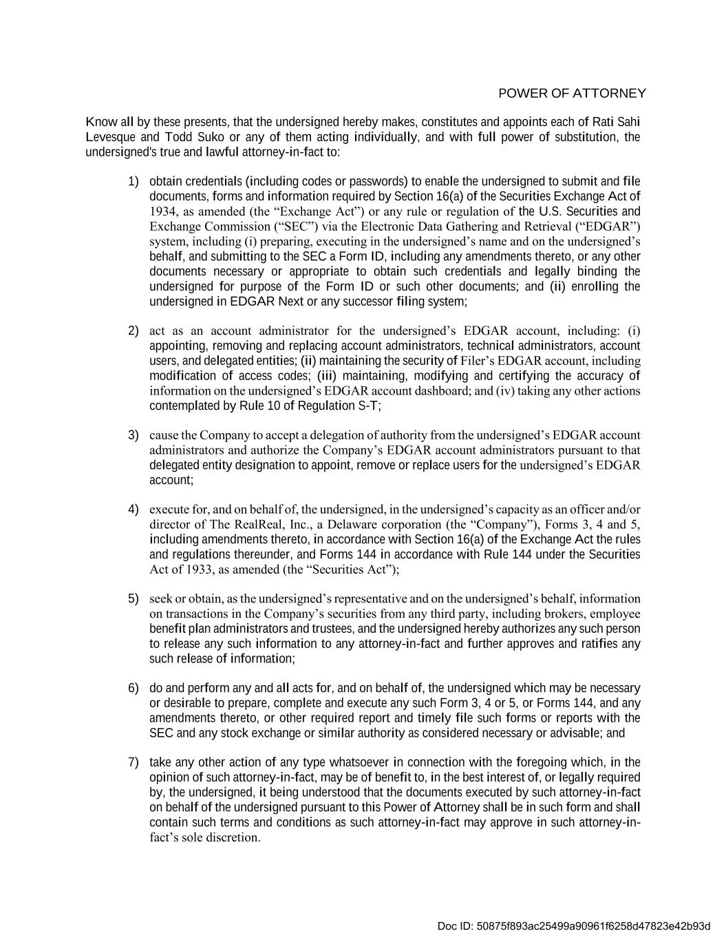 POWER OF ATTORNEY Know all by these presents, that the undersigned hereby makes, constitutes and appoints each of Rati Sahi Levesque and Todd Suko or any of them acting individually, and with full power of substitution, the undersigned's true and lawful attorney-in-fact to: 1) obtain credentials (including codes or passwords) to enable the undersigned to submit and file documents, forms and information required by Section 16(a) of the Securities Exchange Act of 1934, as amended (the “Exchange Act”) or any rule or regulation of the U.S. Securities and Exchange Commission (“SEC”) via the Electronic Data Gathering and Retrieval (“EDGAR”) system, including (i) preparing, executing in the undersigned’s name and on the undersigned’s behalf, and submitting to the SEC a Form ID, including any amendments thereto, or any other documents necessary or appropriate to obtain such credentials and legally binding the undersigned for purpose of the Form ID or such other documents; and (ii) enrolling the undersigned in EDGAR Next or any successor filing system; 2) act as an account administrator for the undersigned’s EDGAR account, including: (i) appointing, removing and replacing account administrators, technical administrators, account users, and delegated entities; (ii) maintaining the security of Filer’s EDGAR account, including modification of access codes; (iii) maintaining, modifying and certifying the accuracy of information on the undersigned’s EDGAR account dashboard; and (iv) taking any other actions contemplated by Rule 10 of Regulation S-T; 3) cause the Company to accept a delegation of authority from the undersigned’s EDGAR account administrators and authorize the Company’s EDGAR account administrators pursuant to that delegated entity designation to appoint, remove or replace users for the undersigned’s EDGAR account; 4) execute for, and on behalf of, the undersigned, in the undersigned’s capacity as an officer and/or director of The RealReal, Inc., a Delaware corporation (the “Company”), Forms 3, 4 and 5, including amendments thereto, in accordance with Section 16(a) of the Exchange Act the rules and regulations thereunder, and Forms 144 in accordance with Rule 144 under the Securities Act of 1933, as amended (the “Securities Act”); 5) seek or obtain, as the undersigned’s representative and on the undersigned’s behalf, information on transactions in the Company’s securities from any third party, including brokers, employee benefit plan administrators and trustees, and the undersigned hereby authorizes any such person to release any such information to any attorney-in-fact and further approves and ratifies any such release of information; 6) do and perform any and all acts for, and on behalf of, the undersigned which may be necessary or desirable to prepare, complete and execute any such Form 3, 4 or 5, or Forms 144, and any amendments thereto, or other required report and timely file such forms or reports with the SEC and any stock exchange or similar authority as considered necessary or advisable; and 7) take any other action of any type whatsoever in connection with the foregoing which, in the opinion of such attorney-in-fact, may be of benefit to, in the best interest of, or legally required by, the undersigned, it being understood that the documents executed by such attorney-in-fact on behalf of the undersigned pursuant to this Power of Attorney shall be in such form and shall contain such terms and conditions as such attorney-in-fact may approve in such attorney-in- fact’s sole discretion. Doc ID: 50875f893ac25499a90961f6258d47823e42b93d