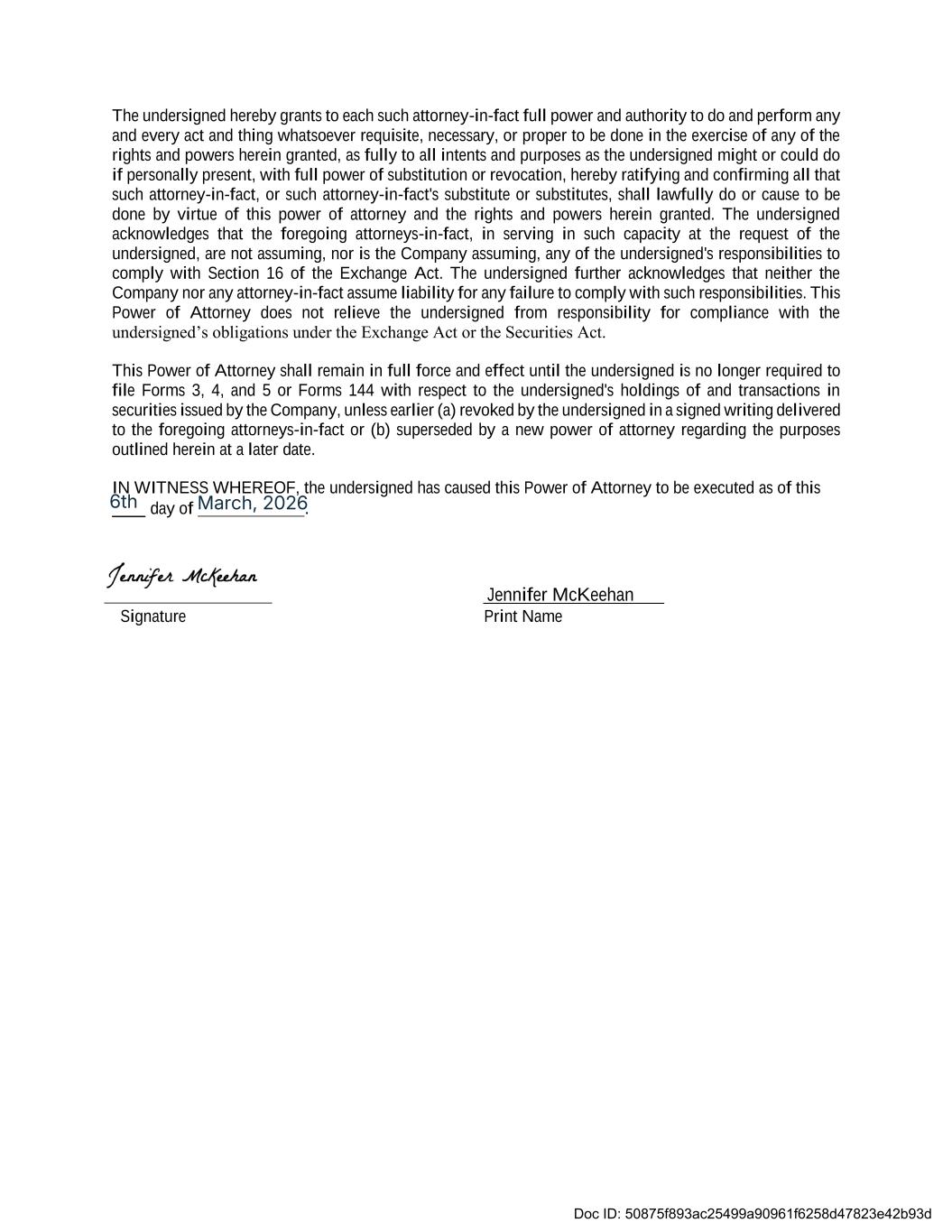 The undersigned hereby grants to each such attorney-in-fact full power and authority to do and perform any and every act and thing whatsoever requisite, necessary, or proper to be done in the exercise of any of the rights and powers herein granted, as fully to all intents and purposes as the undersigned might or could do if personally present, with full power of substitution or revocation, hereby ratifying and confirming all that such attorney-in-fact, or such attorney-in-fact's substitute or substitutes, shall lawfully do or cause to be done by virtue of this power of attorney and the rights and powers herein granted. The undersigned acknowledges that the foregoing attorneys-in-fact, in serving in such capacity at the request of the undersigned, are not assuming, nor is the Company assuming, any of the undersigned's responsibilities to comply with Section 16 of the Exchange Act. The undersigned further acknowledges that neither the Company nor any attorney-in-fact assume liability for any failure to comply with such responsibilities. This Power of Attorney does not relieve the undersigned from responsibility for compliance with the undersigned’s obligations under the Exchange Act or the Securities Act. This Power of Attorney shall remain in full force and effect until the undersigned is no longer required to file Forms 3, 4, and 5 or Forms 144 with respect to the undersigned's holdings of and transactions in securities issued by the Company, unless earlier (a) revoked by the undersigned in a signed writing delivered to the foregoing attorneys-in-fact or (b) superseded by a new power of attorney regarding the purposes outlined herein at a later date. IN WITNESS WHEREOF, the undersigned has caused this Power of Attorney to be executed as of this day of . Jennifer McKeehan Signature Print Name Doc ID: 50875f893ac25499a90961f6258d47823e42b93d