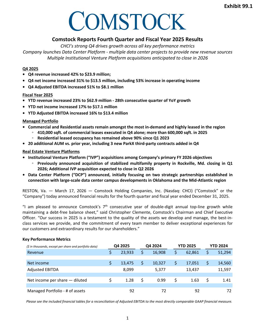 Comstock Reports Fourth Quarter and Fiscal Year 2025 Results CHCI’s strong Q4 drives growth across all key performance metrics Company launches Data Center Platform - multiple data center projects to provide new revenue sources Multiple Institutional Venture Platform acquisitions anticipated to close in 2026 Q4 2025 • Q4 revenue increased 42% to $23.9 million; • Q4 net income increased 31% to $13.5 million, including 53% increase in operating income • Q4 Adjusted EBITDA increased 51% to $8.1 million Fiscal Year 2025 • YTD revenue increased 23% to $62.9 million - 28th consecutive quarter of YoY growth • YTD net income increased 17% to $17.1 million • YTD Adjusted EBITDA increased 16% to $13.4 million Managed Portfolio • Commercial and Residential assets remain amongst the most in-demand and highly leased in the region ◦ 410,000 sqft. of commercial leases executed in Q4 alone; more than 600,000 sqft. in 2025 ◦ Residential leased occupancy has remained above 90% since Q1 2023 • 20 additional AUM vs. prior year, including 3 new ParkX third-party contracts added in Q4 Real Estate Venture Platforms • Institutional Venture Platform (“IVP”) acquisitions among Company’s primary FY 2026 objectives ◦ Previously announced acquisition of stabilized multifamily property in Rockville, Md. closing in Q1 2026; Additional IVP acquisition expected to close in Q2 2026 • Data Center Platform (“DCP”) announced, initially focusing on two strategic partnerships established in connection with large-scale data center campus developments in Oklahoma and the Mid-Atlantic region RESTON, Va. — March 17, 2026 — Comstock Holding Companies, Inc. (Nasdaq: CHCI) (“Comstock” or the “Company”) today announced financial results for the fourth quarter and fiscal year ended December 31, 2025. “I am pleased to announce Comstock’s 7th consecutive year of double-digit annual top-line growth while maintaining a debt-free balance sheet,” said Christopher Clemente, Comstock’s Chairman and Chief Executive Officer. “Our success in 2025 is a testament to the quality of the assets we develop and manage, the best-in- class services we provide, and the commitment of every team member to deliver exceptional experiences for our customers and extraordinary results for our shareholders.” Key Performance Metrics ($ in thousands, except per share and portfolio data) Q4 2025 Q4 2024 YTD 2025 YTD 2024 Revenue $ 23,933 $ 16,908 $ 62,861 $ 51,294 Net income $ 13,475 $ 10,327 $ 17,051 $ 14,560 Adjusted EBITDA 8,099 5,377 13,437 11,597 Net income per share — diluted $ 1.28 $ 0.99 $ 1.63 $ 1.41 Managed Portfolio - # of assets 92 72 92 72 Please see the included financial tables for a reconciliation of Adjusted EBITDA to the most directly comparable GAAP financial measure. 1 Exhibit 99.1