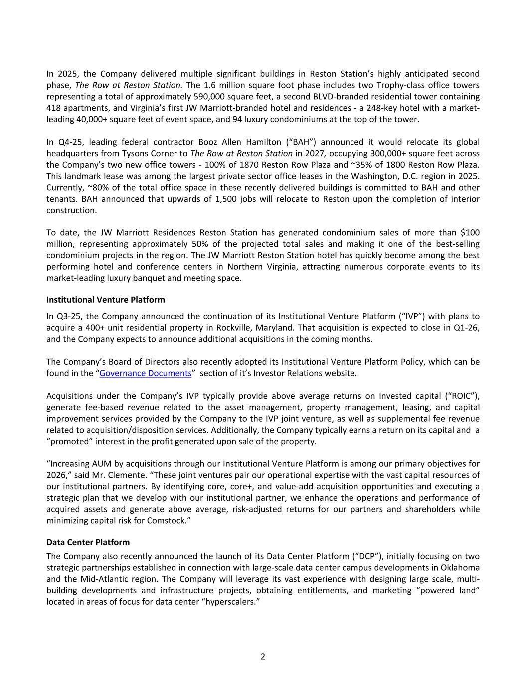 In 2025, the Company delivered multiple significant buildings in Reston Station’s highly anticipated second phase, The Row at Reston Station. The 1.6 million square foot phase includes two Trophy-class office towers representing a total of approximately 590,000 square feet, a second BLVD-branded residential tower containing 418 apartments, and Virginia’s first JW Marriott-branded hotel and residences - a 248-key hotel with a market- leading 40,000+ square feet of event space, and 94 luxury condominiums at the top of the tower. In Q4-25, leading federal contractor Booz Allen Hamilton (“BAH”) announced it would relocate its global headquarters from Tysons Corner to The Row at Reston Station in 2027, occupying 300,000+ square feet across the Company’s two new office towers - 100% of 1870 Reston Row Plaza and ~35% of 1800 Reston Row Plaza. This landmark lease was among the largest private sector office leases in the Washington, D.C. region in 2025. Currently, ~80% of the total office space in these recently delivered buildings is committed to BAH and other tenants. BAH announced that upwards of 1,500 jobs will relocate to Reston upon the completion of interior construction. To date, the JW Marriott Residences Reston Station has generated condominium sales of more than $100 million, representing approximately 50% of the projected total sales and making it one of the best-selling condominium projects in the region. The JW Marriott Reston Station hotel has quickly become among the best performing hotel and conference centers in Northern Virginia, attracting numerous corporate events to its market-leading luxury banquet and meeting space. Institutional Venture Platform In Q3-25, the Company announced the continuation of its Institutional Venture Platform (“IVP”) with plans to acquire a 400+ unit residential property in Rockville, Maryland. That acquisition is expected to close in Q1-26, and the Company expects to announce additional acquisitions in the coming months. The Company’s Board of Directors also recently adopted its Institutional Venture Platform Policy, which can be found in the “Governance Documents” section of it’s Investor Relations website. Acquisitions under the Company’s IVP typically provide above average returns on invested capital (“ROIC”), generate fee-based revenue related to the asset management, property management, leasing, and capital improvement services provided by the Company to the IVP joint venture, as well as supplemental fee revenue related to acquisition/disposition services. Additionally, the Company typically earns a return on its capital and a “promoted” interest in the profit generated upon sale of the property. “Increasing AUM by acquisitions through our Institutional Venture Platform is among our primary objectives for 2026,” said Mr. Clemente. “These joint ventures pair our operational expertise with the vast capital resources of our institutional partners. By identifying core, core+, and value-add acquisition opportunities and executing a strategic plan that we develop with our institutional partner, we enhance the operations and performance of acquired assets and generate above average, risk-adjusted returns for our partners and shareholders while minimizing capital risk for Comstock.” Data Center Platform The Company also recently announced the launch of its Data Center Platform (“DCP”), initially focusing on two strategic partnerships established in connection with large-scale data center campus developments in Oklahoma and the Mid-Atlantic region. The Company will leverage its vast experience with designing large scale, multi- building developments and infrastructure projects, obtaining entitlements, and marketing “powered land” located in areas of focus for data center “hyperscalers.” 2