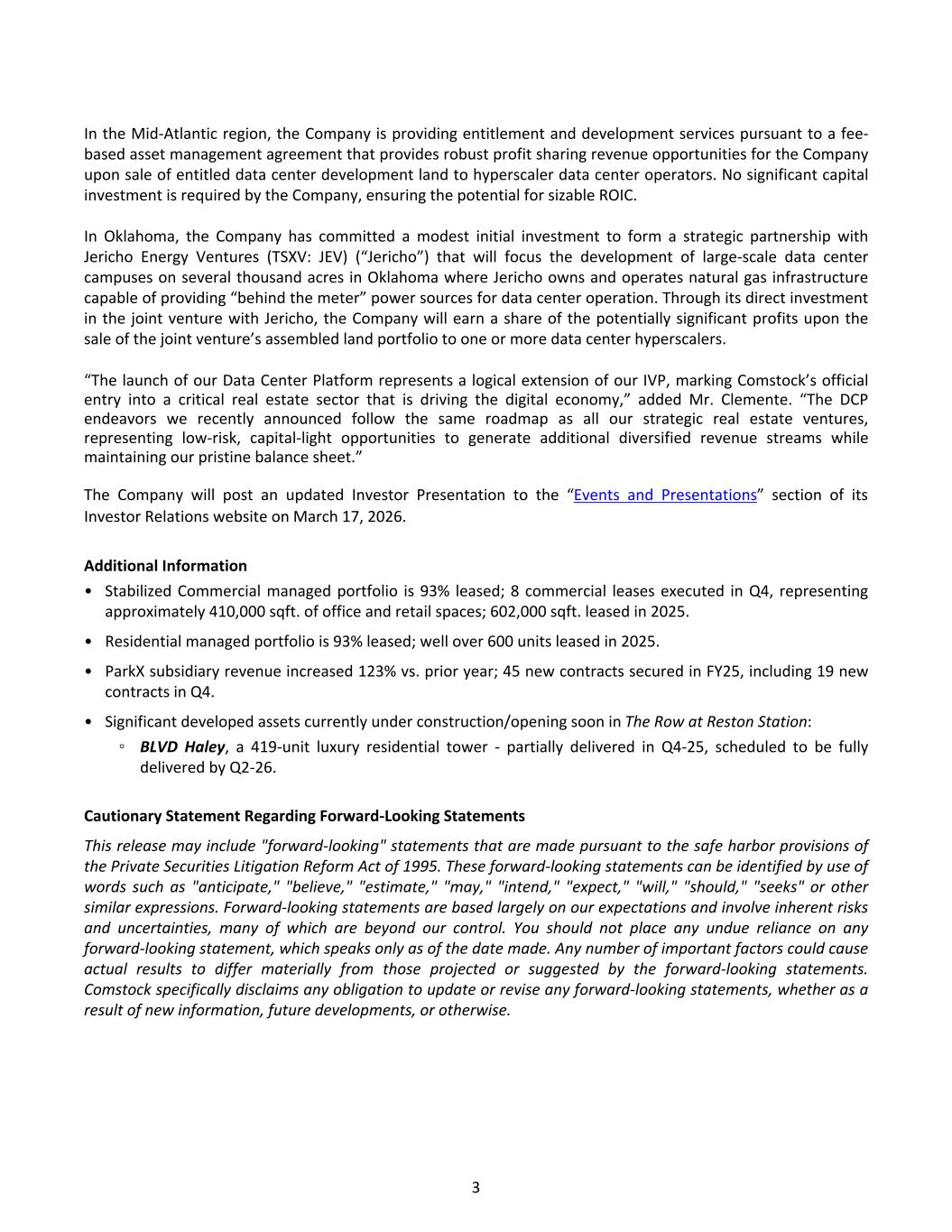 In the Mid-Atlantic region, the Company is providing entitlement and development services pursuant to a fee- based asset management agreement that provides robust profit sharing revenue opportunities for the Company upon sale of entitled data center development land to hyperscaler data center operators. No significant capital investment is required by the Company, ensuring the potential for sizable ROIC. In Oklahoma, the Company has committed a modest initial investment to form a strategic partnership with Jericho Energy Ventures (TSXV: JEV) (“Jericho”) that will focus the development of large-scale data center campuses on several thousand acres in Oklahoma where Jericho owns and operates natural gas infrastructure capable of providing “behind the meter” power sources for data center operation. Through its direct investment in the joint venture with Jericho, the Company will earn a share of the potentially significant profits upon the sale of the joint venture’s assembled land portfolio to one or more data center hyperscalers. “The launch of our Data Center Platform represents a logical extension of our IVP, marking Comstock’s official entry into a critical real estate sector that is driving the digital economy,” added Mr. Clemente. “The DCP endeavors we recently announced follow the same roadmap as all our strategic real estate ventures, representing low-risk, capital-light opportunities to generate additional diversified revenue streams while maintaining our pristine balance sheet.” The Company will post an updated Investor Presentation to the “Events and Presentations” section of its Investor Relations website on March 17, 2026. Additional Information • Stabilized Commercial managed portfolio is 93% leased; 8 commercial leases executed in Q4, representing approximately 410,000 sqft. of office and retail spaces; 602,000 sqft. leased in 2025. • Residential managed portfolio is 93% leased; well over 600 units leased in 2025. • ParkX subsidiary revenue increased 123% vs. prior year; 45 new contracts secured in FY25, including 19 new contracts in Q4. • Significant developed assets currently under construction/opening soon in The Row at Reston Station: ◦ BLVD Haley, a 419-unit luxury residential tower - partially delivered in Q4-25, scheduled to be fully delivered by Q2-26. Cautionary Statement Regarding Forward-Looking Statements This release may include "forward-looking" statements that are made pursuant to the safe harbor provisions of the Private Securities Litigation Reform Act of 1995. These forward-looking statements can be identified by use of words such as "anticipate," "believe," "estimate," "may," "intend," "expect," "will," "should," "seeks" or other similar expressions. Forward-looking statements are based largely on our expectations and involve inherent risks and uncertainties, many of which are beyond our control. You should not place any undue reliance on any forward-looking statement, which speaks only as of the date made. Any number of important factors could cause actual results to differ materially from those projected or suggested by the forward-looking statements. Comstock specifically disclaims any obligation to update or revise any forward-looking statements, whether as a result of new information, future developments, or otherwise. 3
