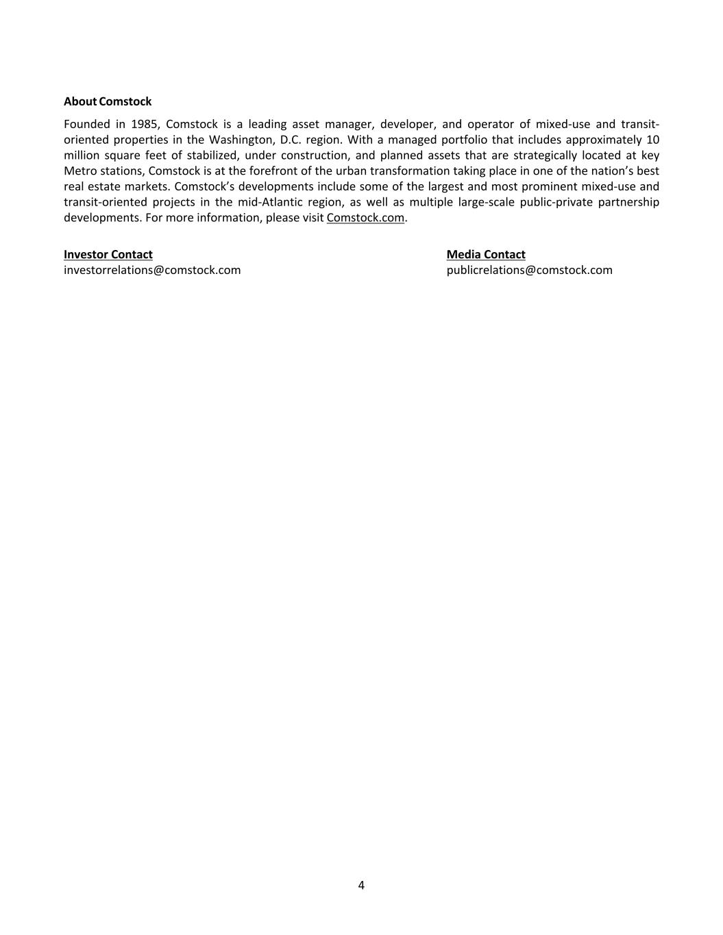 About Comstock Founded in 1985, Comstock is a leading asset manager, developer, and operator of mixed-use and transit- oriented properties in the Washington, D.C. region. With a managed portfolio that includes approximately 10 million square feet of stabilized, under construction, and planned assets that are strategically located at key Metro stations, Comstock is at the forefront of the urban transformation taking place in one of the nation’s best real estate markets. Comstock’s developments include some of the largest and most prominent mixed-use and transit-oriented projects in the mid-Atlantic region, as well as multiple large-scale public-private partnership developments. For more information, please visit Comstock.com. Investor Contact Media Contact investorrelations@comstock.com publicrelations@comstock.com 4