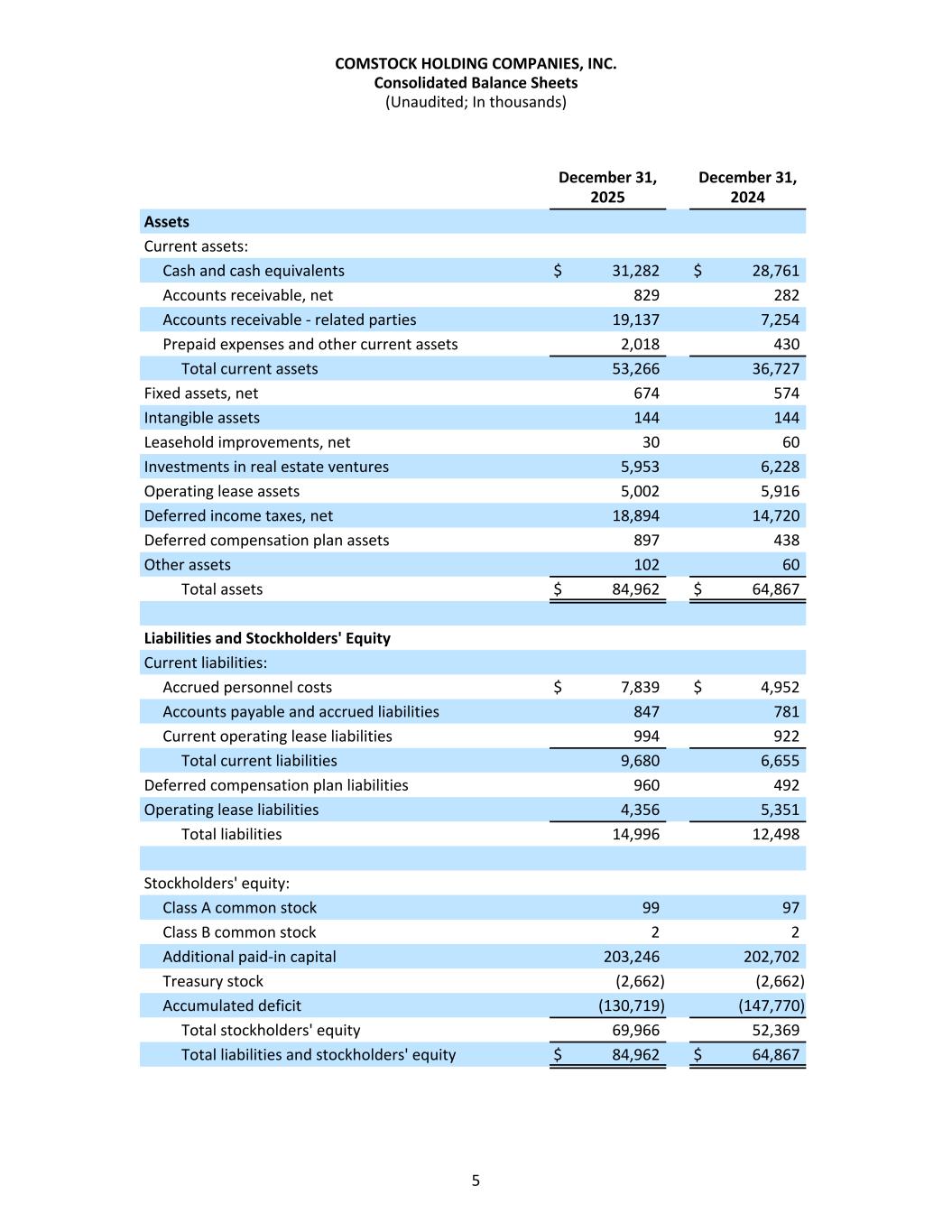 December 31, December 31, 2025 2024 Assets Current assets: Cash and cash equivalents $ 31,282 $ 28,761 Accounts receivable, net 829 282 Accounts receivable - related parties 19,137 7,254 Prepaid expenses and other current assets 2,018 430 Total current assets 53,266 36,727 Fixed assets, net 674 574 Intangible assets 144 144 Leasehold improvements, net 30 60 Investments in real estate ventures 5,953 6,228 Operating lease assets 5,002 5,916 Deferred income taxes, net 18,894 14,720 Deferred compensation plan assets 897 438 Other assets 102 60 Total assets $ 84,962 $ 64,867 Liabilities and Stockholders' Equity Current liabilities: Accrued personnel costs $ 7,839 $ 4,952 Accounts payable and accrued liabilities 847 781 Current operating lease liabilities 994 922 Total current liabilities 9,680 6,655 Deferred compensation plan liabilities 960 492 Operating lease liabilities 4,356 5,351 Total liabilities 14,996 12,498 Stockholders' equity: Class A common stock 99 97 Class B common stock 2 2 Additional paid-in capital 203,246 202,702 Treasury stock (2,662) (2,662) Accumulated deficit (130,719) (147,770) Total stockholders' equity 69,966 52,369 Total liabilities and stockholders' equity $ 84,962 $ 64,867 COMSTOCK HOLDING COMPANIES, INC. Consolidated Balance Sheets (Unaudited; In thousands) 5