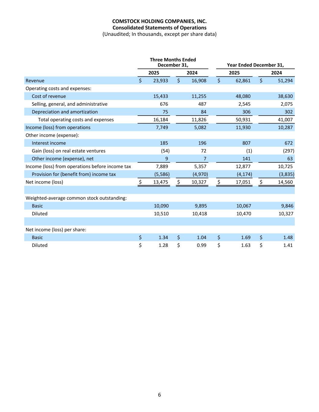 Three Months Ended December 31, Year Ended December 31, 2025 2024 2025 2024 Revenue $ 23,933 $ 16,908 $ 62,861 $ 51,294 Operating costs and expenses: Cost of revenue 15,433 11,255 48,080 38,630 Selling, general, and administrative 676 487 2,545 2,075 Depreciation and amortization 75 84 306 302 Total operating costs and expenses 16,184 11,826 50,931 41,007 Income (loss) from operations 7,749 5,082 11,930 10,287 Other income (expense): Interest income 185 196 807 672 Gain (loss) on real estate ventures (54) 72 (1) (297) Other income (expense), net 9 7 141 63 Income (loss) from operations before income tax 7,889 5,357 12,877 10,725 Provision for (benefit from) income tax (5,586) (4,970) (4,174) (3,835) Net income (loss) $ 13,475 $ 10,327 $ 17,051 $ 14,560 Weighted-average common stock outstanding: Basic 10,090 9,895 10,067 9,846 Diluted 10,510 10,418 10,470 10,327 Net income (loss) per share: Basic $ 1.34 $ 1.04 $ 1.69 $ 1.48 Diluted $ 1.28 $ 0.99 $ 1.63 $ 1.41 COMSTOCK HOLDING COMPANIES, INC. Consolidated Statements of Operations (Unaudited; In thousands, except per share data) 6
