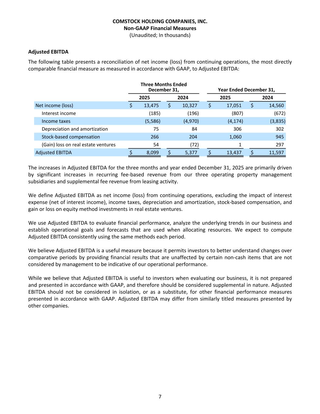 Adjusted EBITDA The following table presents a reconciliation of net income (loss) from continuing operations, the most directly comparable financial measure as measured in accordance with GAAP, to Adjusted EBITDA: Three Months Ended December 31, Year Ended December 31, 2025 2024 2025 2024 Net income (loss) $ 13,475 $ 10,327 $ 17,051 $ 14,560 Interest income (185) (196) (807) (672) Income taxes (5,586) (4,970) (4,174) (3,835) Depreciation and amortization 75 84 306 302 Stock-based compensation 266 204 1,060 945 (Gain) loss on real estate ventures 54 (72) 1 297 Adjusted EBITDA $ 8,099 $ 5,377 $ 13,437 $ 11,597 The increases in Adjusted EBITDA for the three months and year ended December 31, 2025 are primarily driven by significant increases in recurring fee-based revenue from our three operating property management subsidiaries and supplemental fee revenue from leasing activity. We define Adjusted EBITDA as net income (loss) from continuing operations, excluding the impact of interest expense (net of interest income), income taxes, depreciation and amortization, stock-based compensation, and gain or loss on equity method investments in real estate ventures. We use Adjusted EBITDA to evaluate financial performance, analyze the underlying trends in our business and establish operational goals and forecasts that are used when allocating resources. We expect to compute Adjusted EBITDA consistently using the same methods each period. We believe Adjusted EBITDA is a useful measure because it permits investors to better understand changes over comparative periods by providing financial results that are unaffected by certain non-cash items that are not considered by management to be indicative of our operational performance. While we believe that Adjusted EBITDA is useful to investors when evaluating our business, it is not prepared and presented in accordance with GAAP, and therefore should be considered supplemental in nature. Adjusted EBITDA should not be considered in isolation, or as a substitute, for other financial performance measures presented in accordance with GAAP. Adjusted EBITDA may differ from similarly titled measures presented by other companies. COMSTOCK HOLDING COMPANIES, INC. Non-GAAP Financial Measures (Unaudited; In thousands) 7