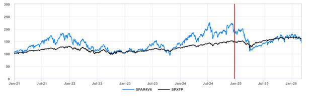 The graph below shows the performance, from January 1, 2021 through March 13, 2026, of the SPAR4V6 Index and the S&P 500® Futures Excess Return Index.