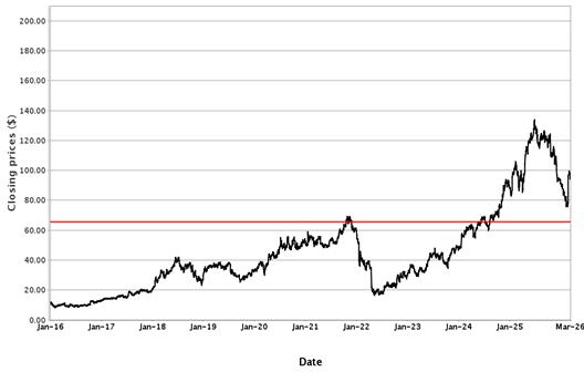 The following graph sets forth historical closing values of the Underlier for the period from January 1, 2016 to March 13, 2026. The red line represents the Coupon Threshold and Barrier Value. We obtained the information in the graph from Bloomberg Financial Markets, without independent investigation. We cannot give you assurance that the performance of the Underlier will result in the return of all of your initial investment.