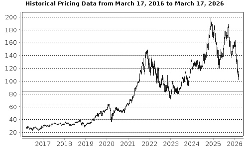 The graph below illustrates the performance of Blackstone's common stock for the period indicated, based on the daily closing levels as reported by Bloomberg, without independent verification. UBS has not conducted any independent review or due diligence of any publicly available information obtained from Bloomberg. The solid line represents its coupon barrier and downside threshold of $84.00, which is equal to 75.00% of the closing level on March 17, 2026. Past performance of the underlying asset is not indicative of the future performance of the underlying asset during the term of the Notes. |