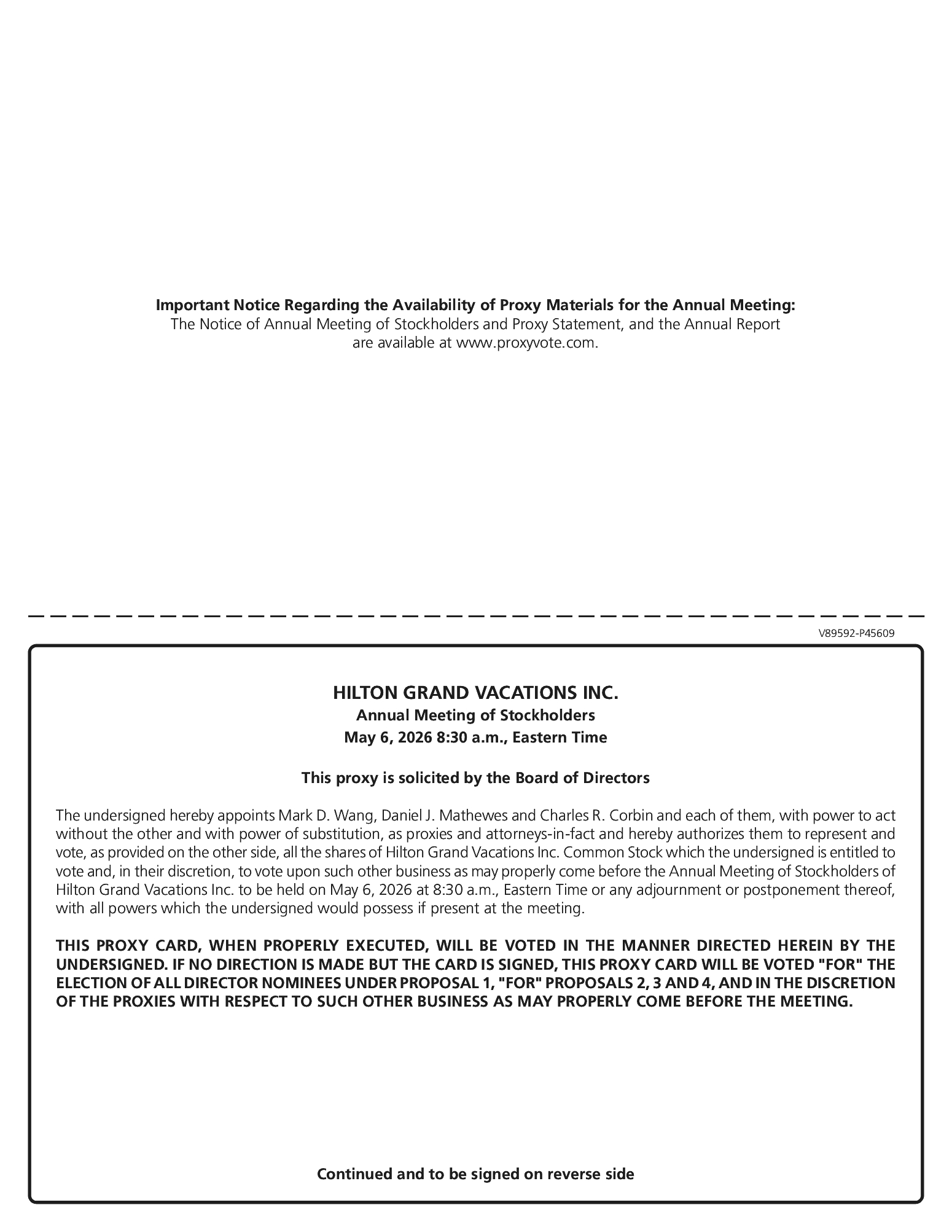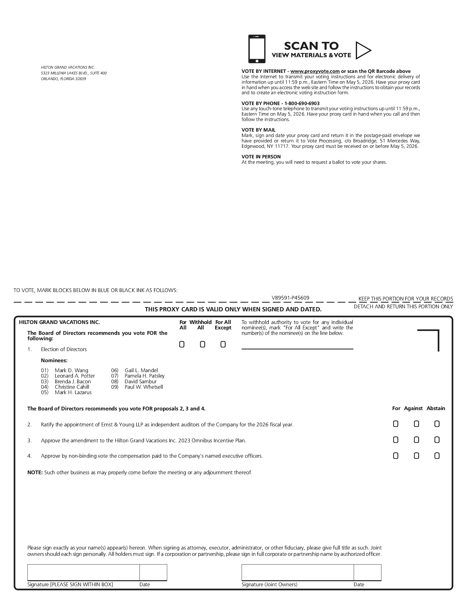 At the annual meeting, stockholders will be considering nine director nominees for election to our board of directors. We encourage you to review the qualifications and experience of the director nominees beginning on page 7 of the proxy statement. In addition to the election of directors, stockholders will also be considering (i) the ratification of the appointment of Ernst & Young LLP as our independent auditors for the 2026 fiscal year, (ii) a proposal to approve an amendment to the Hilton Grand Vacations Inc. 2023 Omnibus Incentive Plan, and (iii) a non-binding advisory vote to approve the compensation of our named executive officers.