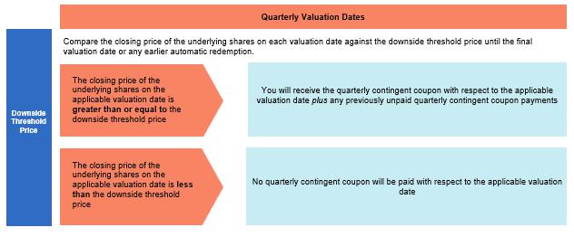 | Contingent coupon: | On each quarterly contingent coupon payment date, unless previously automatically redeemed, the securities will pay a contingent coupon equal to 3.00% of the stated principal amount of the securities (12.00% per annum) if and only if the closing price of the underlying shares on the related valuation date is greater than or equal to the downside threshold price. If the closing price of the underlying shares on any quarterly valuation date is less than the downside threshold price, you will not receive any contingent coupon payment on the related contingent coupon payment date. If the closing price of the underlying shares is less than the downside threshold price on one or more valuation dates and, on a subsequent valuation date, the closing price of the underlying shares is greater than or equal to the downside threshold price, your contingent coupon payment for that subsequent valuation date will include all previously unpaid quarterly contingent coupon payments (without interest on amounts previously unpaid). However, if the closing price of the underlying shares is less than the downside threshold price on any valuation date and on each subsequent valuation date thereafter, you will not receive the unpaid contingent coupon payments in respect of those valuation dates. | ||
