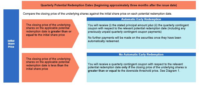 In Examples 1 and 2, the closing price of the underlying shares fluctuates over the term of the securities and the closing price of the underlying shares is greater than or equal to the initial share price on one of the potential redemption dates, which begin approximately three months after the issue date. Because the closing price of the underlying shares is greater than or equal to the initial share price on one of the potential redemption dates, the securities are automatically redeemed following the relevant potential redemption date. In Examples 3 and 4, the closing price of the underlying shares on each potential redemption date is less than the initial share price, and, consequently, the securities are not automatically redeemed prior to, and remain outstanding until, maturity.