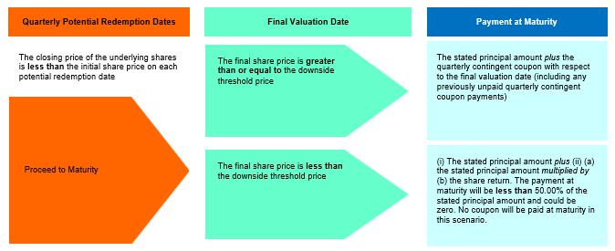 If the closing price of the underlying shares is greater than or equal to the initial share price on any potential redemption date (beginning approximately three months after the issue date), the securities will be automatically redeemed for an early redemption payment equal to the stated principal amount plus the quarterly contingent coupon payment with respect to the related potential redemption date (including any previously unpaid quarterly contingent coupon payments). If the securities have not previously been automatically redeemed and the final share price is greater than or equal to the downside threshold price, the payment at maturity will also be the sum of the stated principal amount and the quarterly contingent coupon payment due at maturity (including any previously unpaid quarterly contingent coupon payments). However, if the securities have not previously been automatically redeemed and the final share price is less than the downside threshold price, investors will be exposed to the decline in the closing price of the underlying shares, as compared to the initial share price, on a 1-to-1 basis (and, in addition, will not receive any quarterly contingent coupon payment at maturity, including any previously unpaid quarterly contingent coupon payments). Under these circumstances, the payment at maturity will be (i) the stated principal amount plus (ii) (a) the stated principal amount times (b) the share return, which means that the payment at maturity will be less than 50.00% of the stated principal amount of the securities and could be zero. Investors in the securities must be willing to accept the risk of losing their entire principal and also the risk of receiving few or no quarterly contingent coupon payments over the term of the securities. In addition, investors will not participate in any appreciation of the underlying shares.