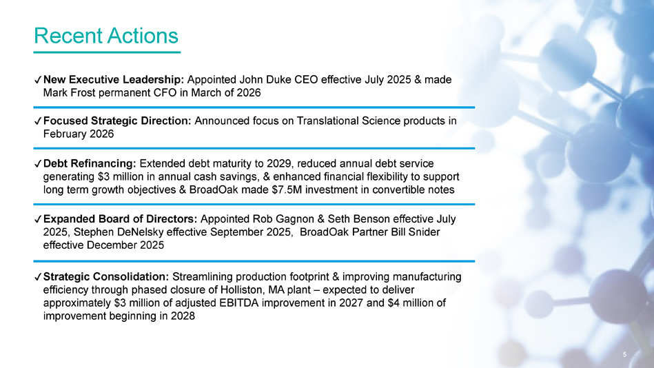 Recent Actions ✔ New Executive Leadership: Appointed John Duke CEO effective July 2025 & made Mark Frost permanent CFO in March of 2026 ✔ Debt Refinancing: E xtended debt maturity to 2029, reduced annual debt service generating $3 million in annual cash savings, & enhanced financial flexibility to support long term growth objectives & BroadOak made $7.5M investment in convertible notes ✔ Expanded Board of Directors: Appointed Rob Gagnon & Seth Benson effective July 2025, Stephen DeNelsky effective September 2025, BroadOak Partner Bill Snider effective December 2025 ✔ Strategic Consolidation: Streamlining production footprint & improving manufacturing efficiency through phased closure of Holliston, MA plant – expected to deliver approximately $3 million of adjusted EBITDA improvement in 2027 and $4 million of improvement beginning in 2028 5 ✔ Focused Strategic Direction: Announced focus on Translational Science products in February 2026