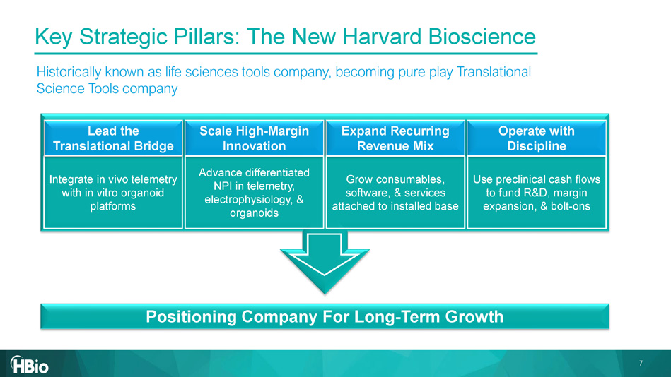 Investment Highlights: Strong Foundation Poised for Growth Market Leadership with Structural Tailwinds #1 preclinical telemetry franchise for 35+ years, & early organoid leadership Blue - Chip Customer Base Selling to diverse, blue - chip customer base on a global scale Recurring Revenue, High Margins & Positive Cash Flow Software, consumables, installed base drive visibility & margin expansion on products with high barrier to entry, generating increased cash for the Company Differentiated New Product Innovation (NPI) Pipeline MeshMEA , SoHo , Incub8 extend leadership into high - growth adjacencies New Management & BoD Refocused management team with deep experience supported by technically deep employee base & refreshed board of directors Strengthened Balance Sheet & Streamlined Operations Refinancing & manufacturing consolidation unlock operating leverage 6